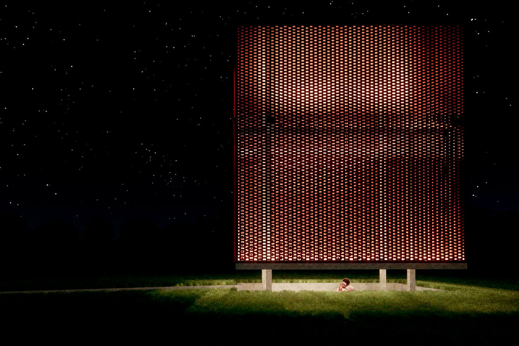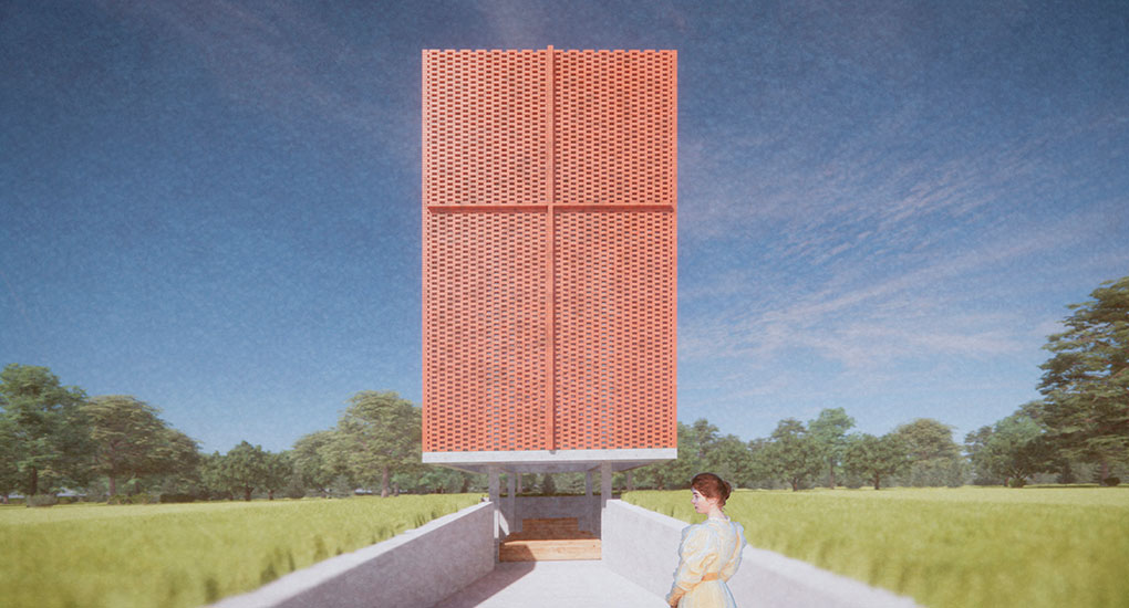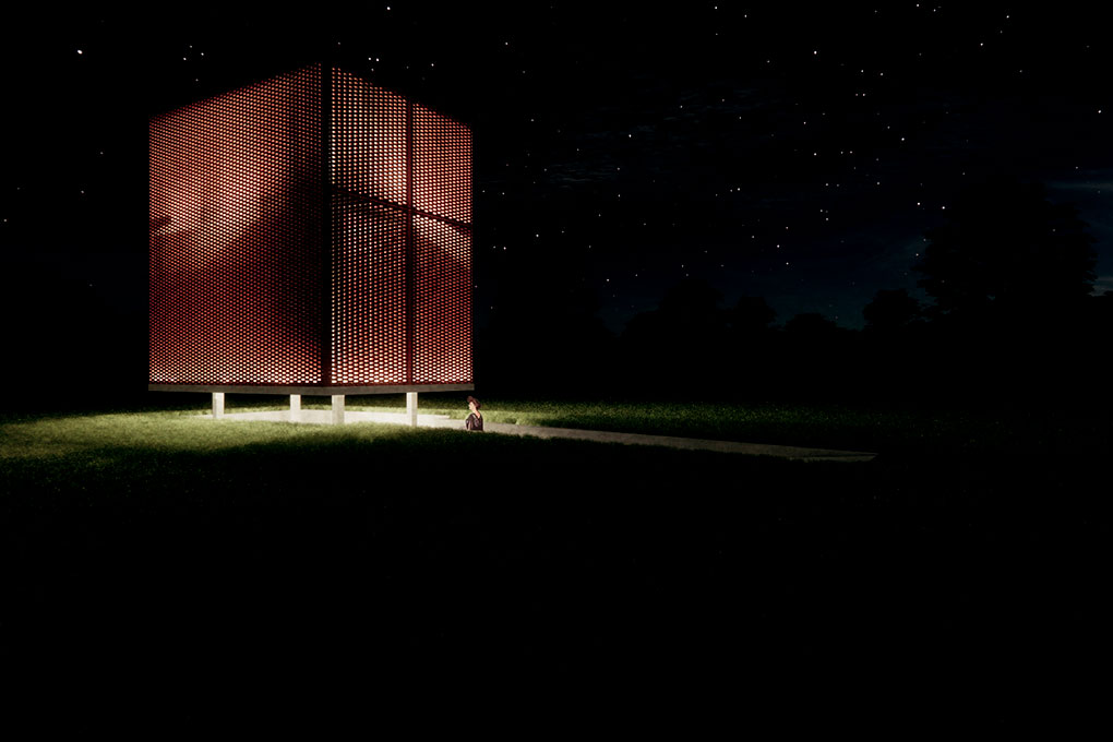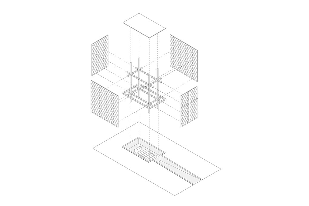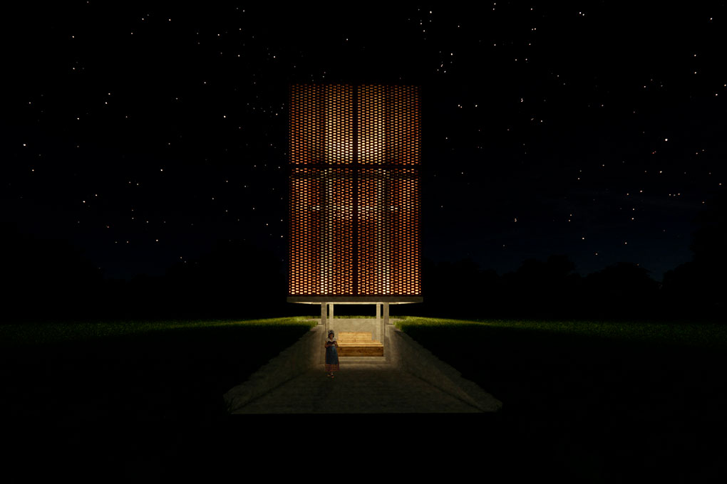 Esta pequena construção tem dois objetivos principais: proporcionar sombra a um pequeno espaço coberto de acolhimento para a comunidade local e servir como um marco vertical de referência visual no meio de uma paisagem que é majoritariamente horizontal. Utilizamos o “retângulo de ouro” relacionado à proporção áurea (ou “proporção divina”) na relação entre as dimensões de cada uma das partes da construção. Trata-se de um espaço sem esquadrias, uma característica que permite a ventilação natural permanente.