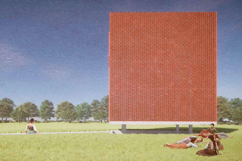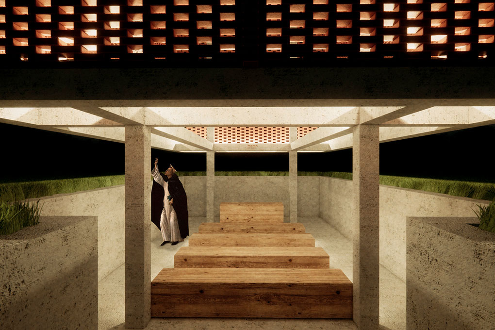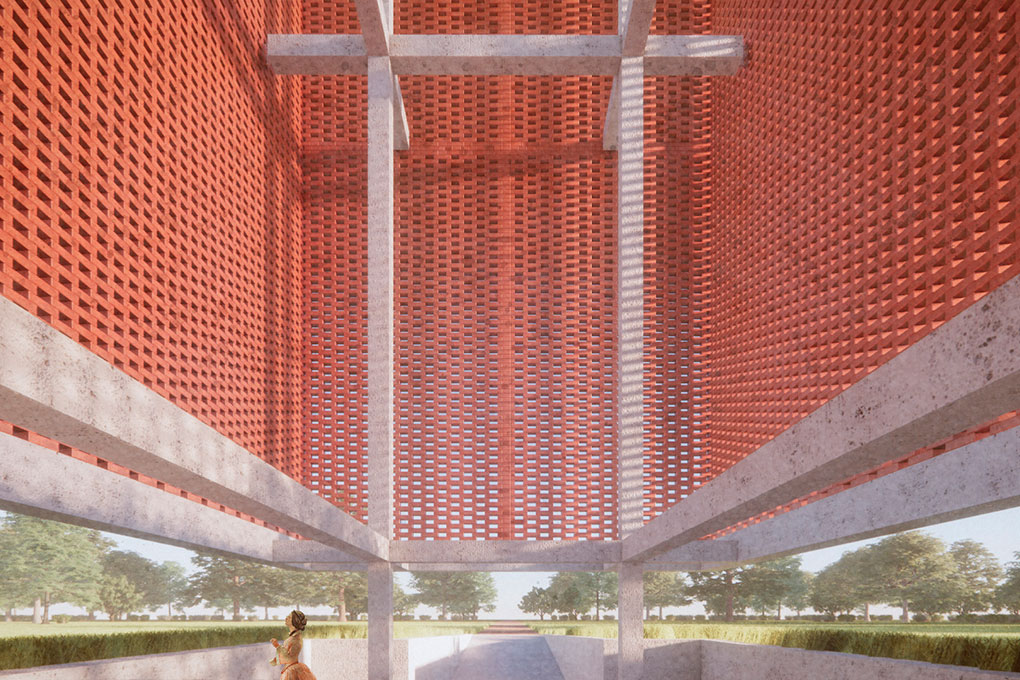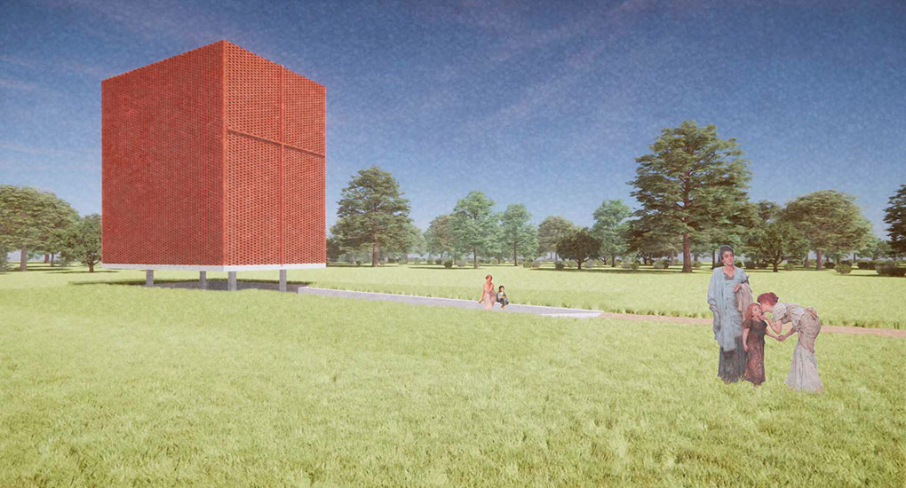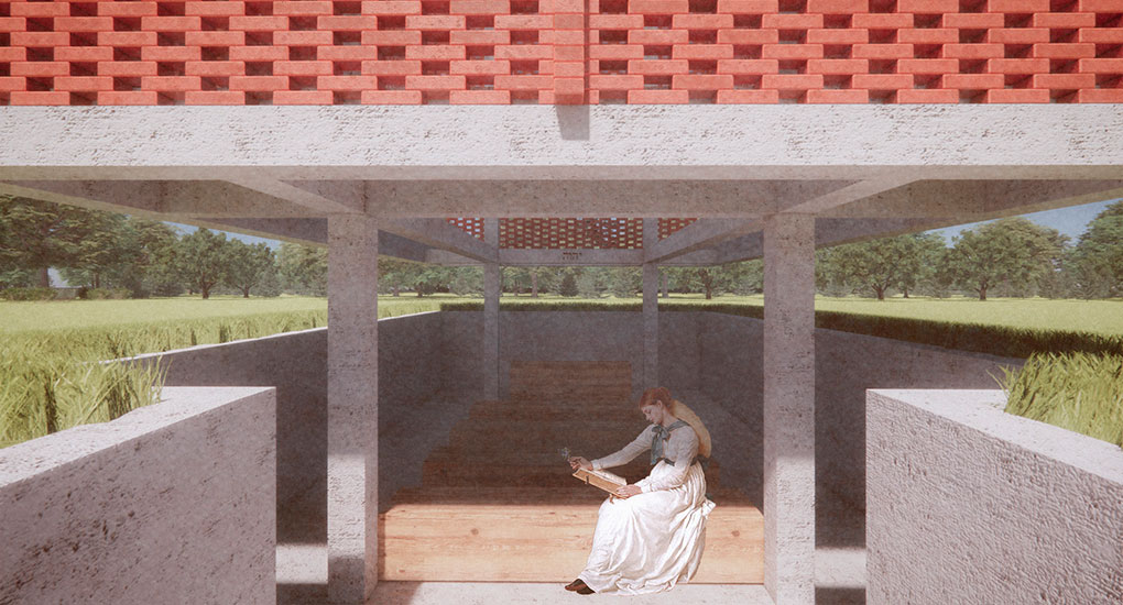 Esta pequena construção tem dois objetivos principais: proporcionar sombra a um pequeno espaço coberto de acolhimento para a comunidade local e servir como um marco vertical de referência visual no meio de uma paisagem que é majoritariamente horizontal. Utilizamos o “retângulo de ouro” relacionado à proporção áurea (ou “proporção divina”) na relação entre as dimensões de cada uma das partes da construção. Trata-se de um espaço sem esquadrias, uma característica que permite a ventilação natural permanente.