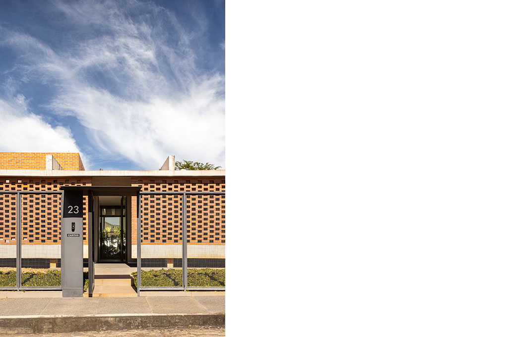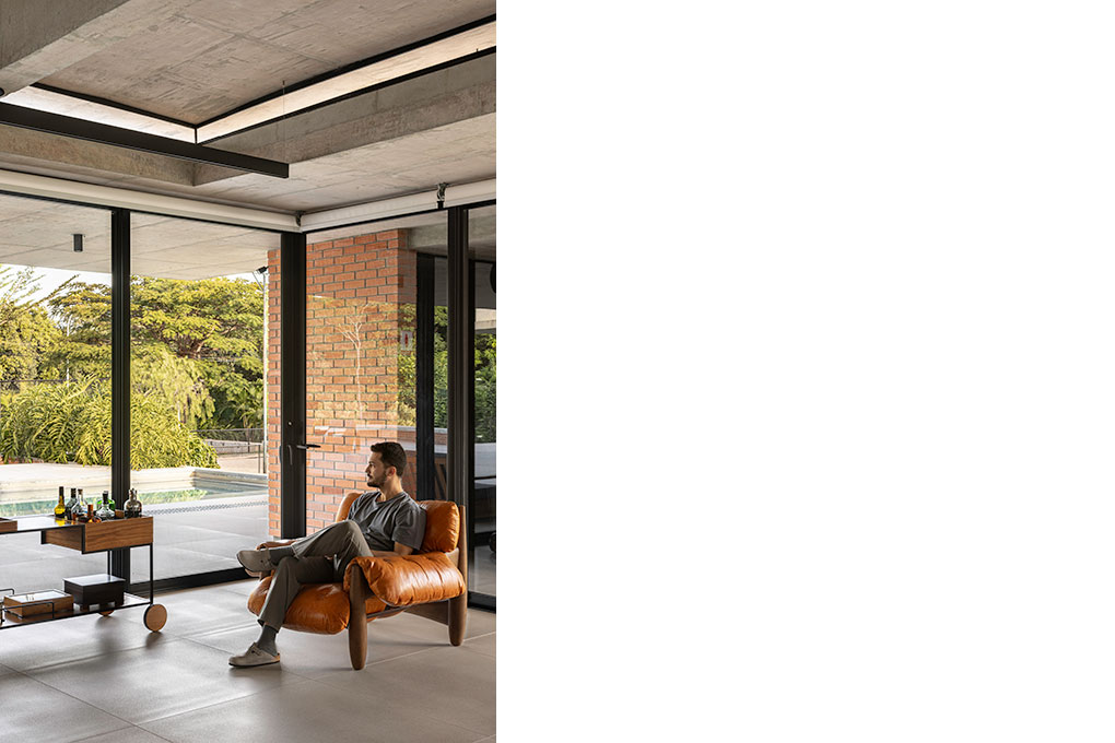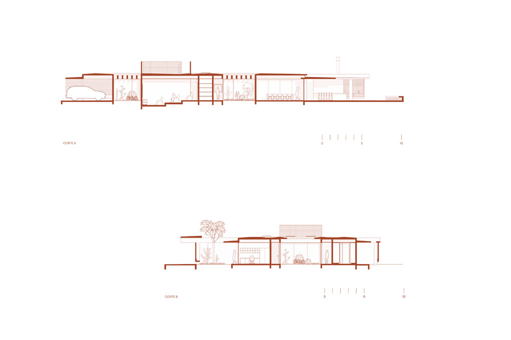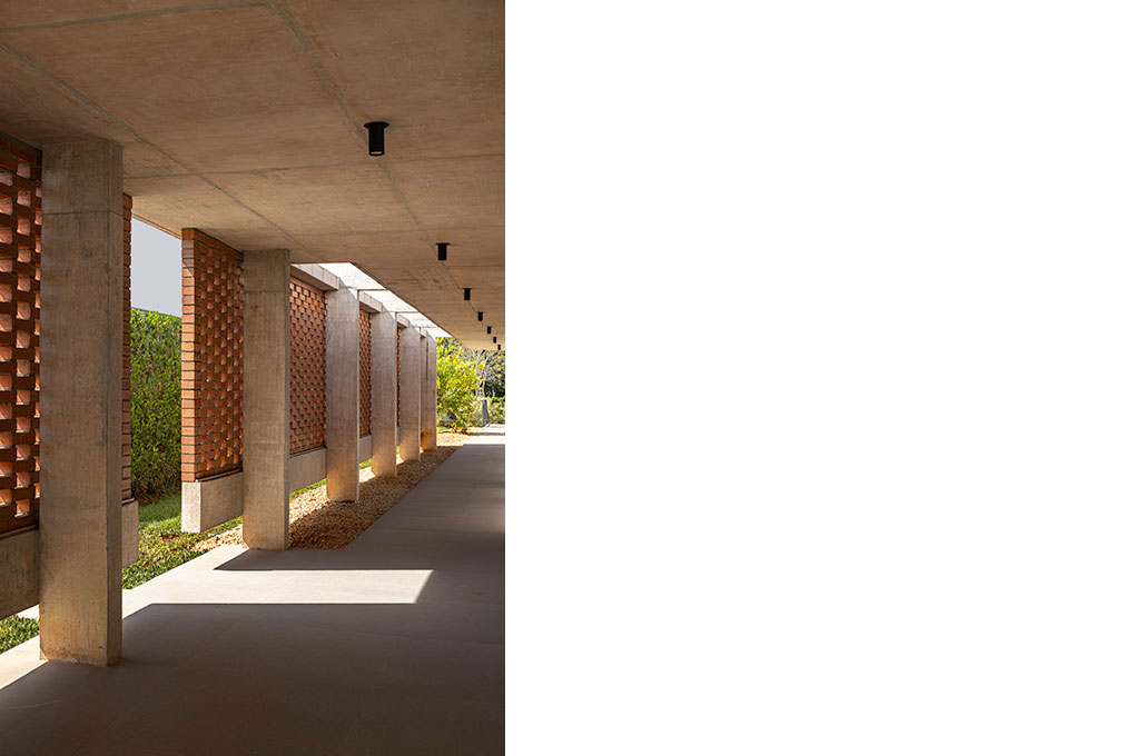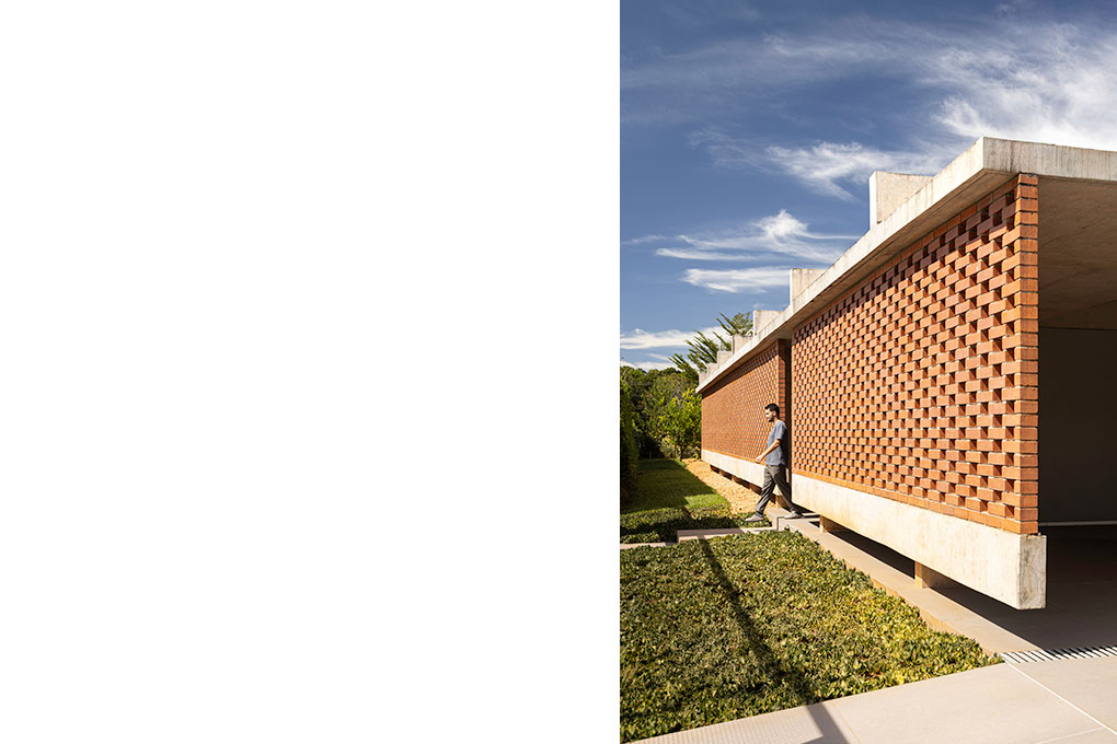 A casa está localizada em um terreno no Lago Sul, um bairro residencial em Brasília. Enquanto no interior de sua área central a maior parte dos ambientes funcionam como “caixa neutra” com paredes e forros na cor branca, o prolongamento da estrutura de pilares e vigas de concreto foi deixado aparente nos jardins internos e em todo o perímetro, conformando a sala, varanda, jardins dos quartos e áreas complementares de garagem e serviço. Desta forma, criamos uma espécie de “camada de proteção” que tem contato direto com as intempéries. Ela é constituída majoritariamente por concreto aparente e tijolo – materiais com baixa necessidade de manutenção que ficarão lentamente marcados pela passagem do tempo. Os quartos ficam voltados para pequenos jardins que são protegidos do sol da tarde por uma parede vazada de tijolos cerâmicos e uma marquise de concreto que também serve de proteção para o acesso principal. A parede de tijolos suspensa do chão é apoiada em uma viga de concreto conectada a uma laje contínua que serve de banco voltado para o jardim interno. Sua estrutura convencional de concreto com vãos regulares máximos de 3,5 e 6,5 metros entre pilares não fazem necessária a protensão.