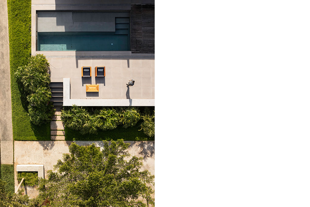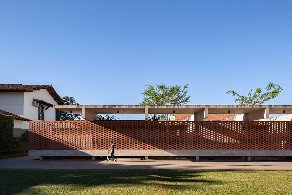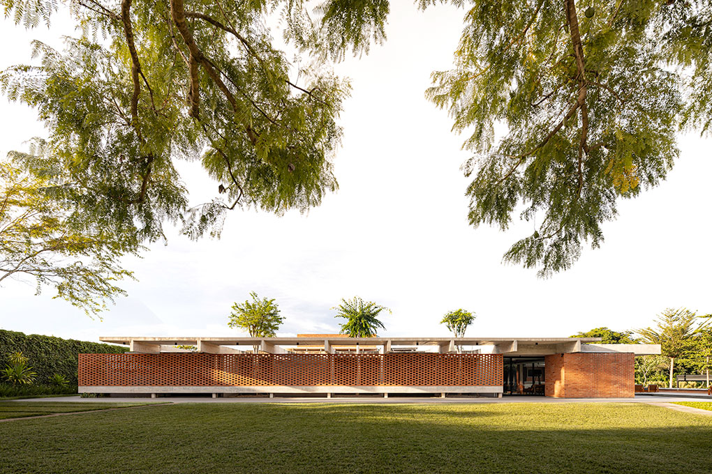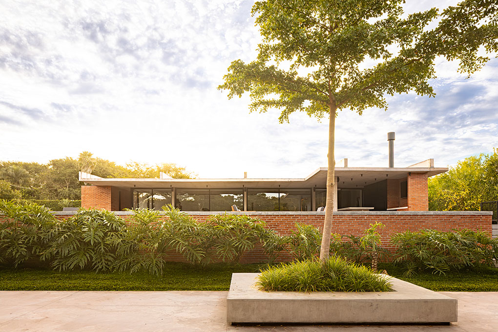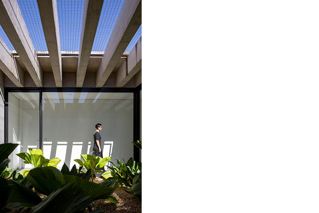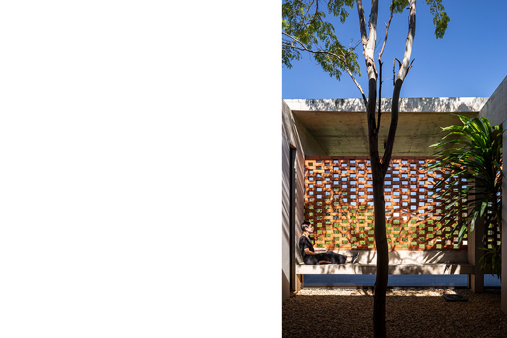 A casa está localizada em um terreno no Lago Sul, um bairro residencial em Brasília. Enquanto no interior de sua área central a maior parte dos ambientes funcionam como “caixa neutra” com paredes e forros na cor branca, o prolongamento da estrutura de pilares e vigas de concreto foi deixado aparente nos jardins internos e em todo o perímetro, conformando a sala, varanda, jardins dos quartos e áreas complementares de garagem e serviço. Desta forma, criamos uma espécie de “camada de proteção” que tem contato direto com as intempéries. Ela é constituída majoritariamente por concreto aparente e tijolo – materiais com baixa necessidade de manutenção que ficarão lentamente marcados pela passagem do tempo. Os quartos ficam voltados para pequenos jardins que são protegidos do sol da tarde por uma parede vazada de tijolos cerâmicos e uma marquise de concreto que também serve de proteção para o acesso principal. A parede de tijolos suspensa do chão é apoiada em uma viga de concreto conectada a uma laje contínua que serve de banco voltado para o jardim interno. Sua estrutura convencional de concreto com vãos regulares máximos de 3,5 e 6,5 metros entre pilares não fazem necessária a protensão.