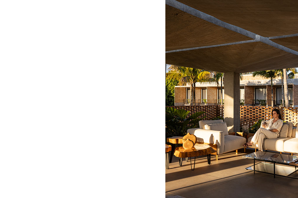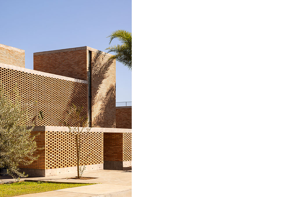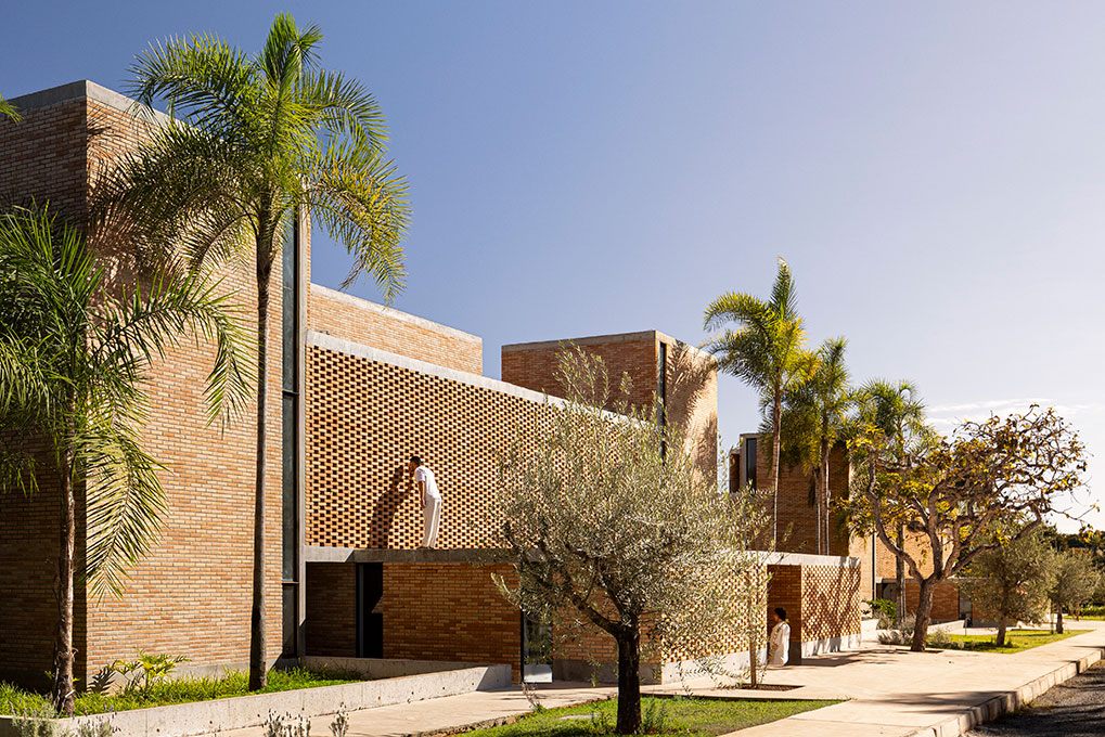 A solução adotada baseia-se na repetição de um módulo arquitetônico, configurando duas casas “duplas”, com módulos espelhados, e uma casa simples. Essa estratégia garante flexibilidade de uso e possibilidade de adaptação entre unidades, unidas por varandas e terraços compartilhados.