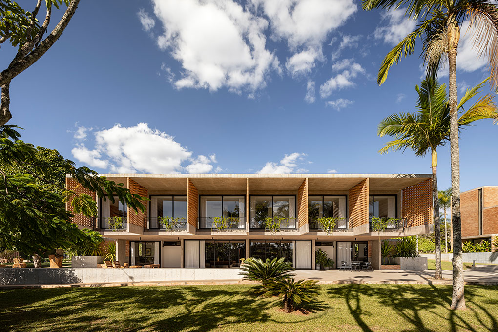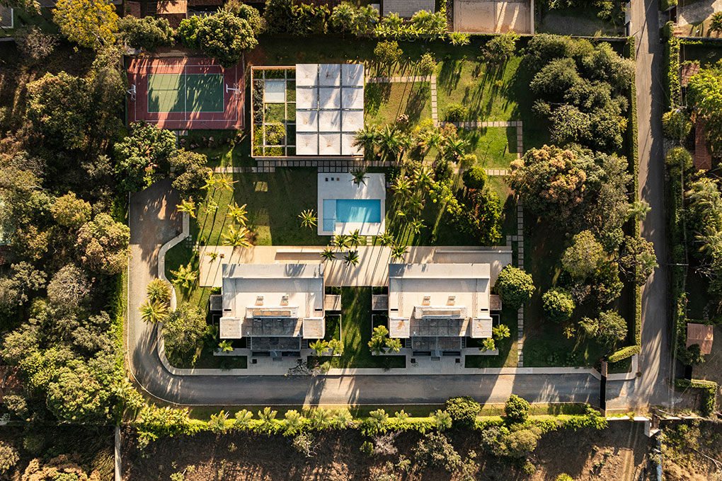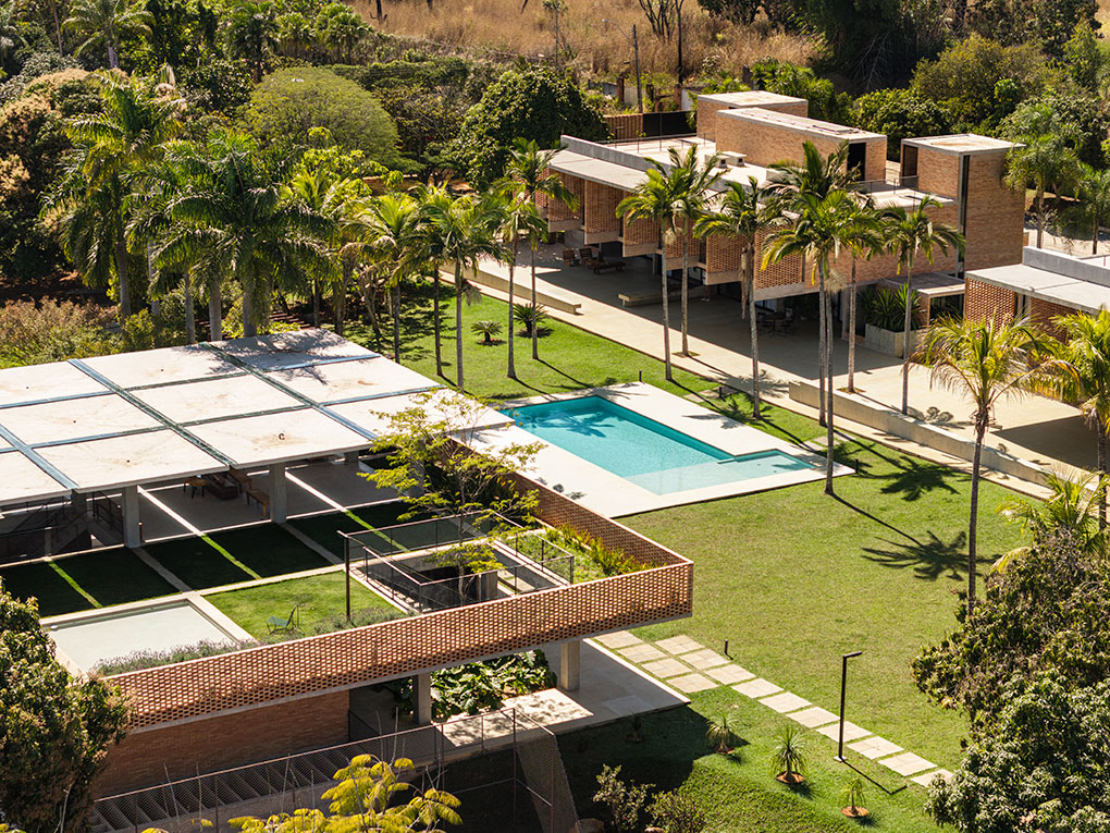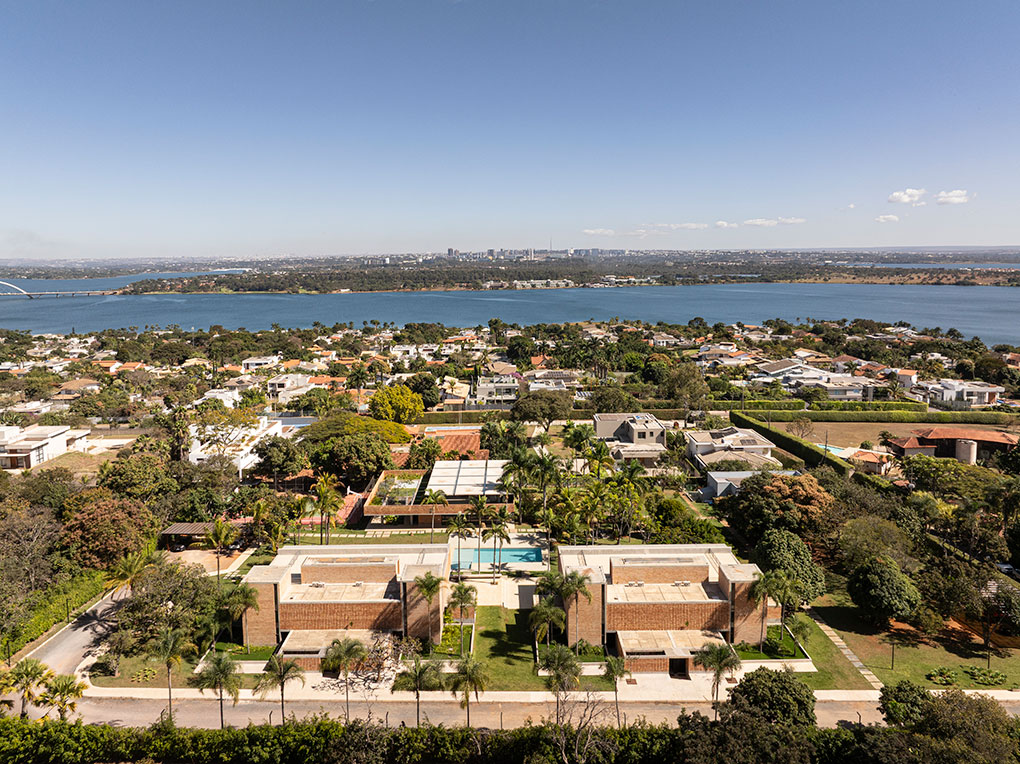 Localizado em um terreno de 20.000 m² no Lago Sul, em Brasília, o condomínio foi projetado para uma mesma família, composta pelos pais e seus quatro filhos, que desejavam coabitar o espaço de forma independente, mas integrada. O desafio foi acomodar cinco famílias e uma edificação de apoio em apenas quatro parcelas permitidas pela norma, sem cercas ou divisões físicas.