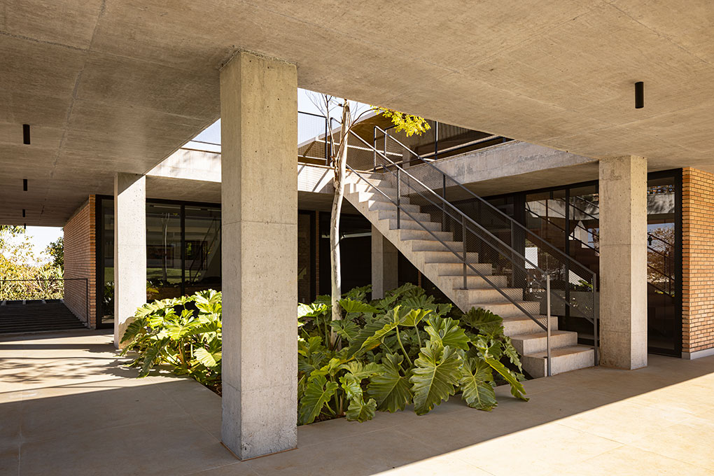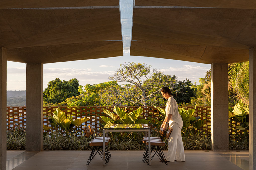 A edificação de apoio reúne escritórios, biblioteca, salão de eventos e um mirante semicoberto com vista para o Lago. As lajes tipo “cogumelo” de sombreamento do terraço não se tocam entre si, criando frestas envidraçadas para a entrada de luz natural direta. A maior parte da vegetação original foi preservada, incluindo palmeiras de grande porte transplantadas e reposicionadas durante a obra.