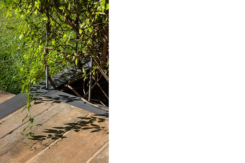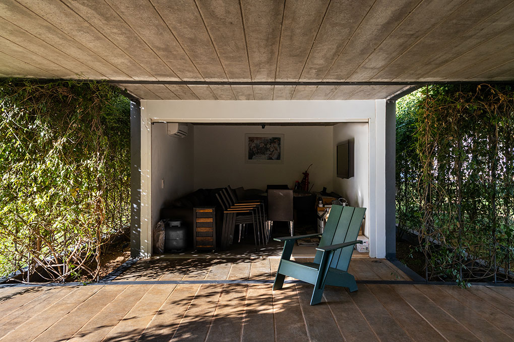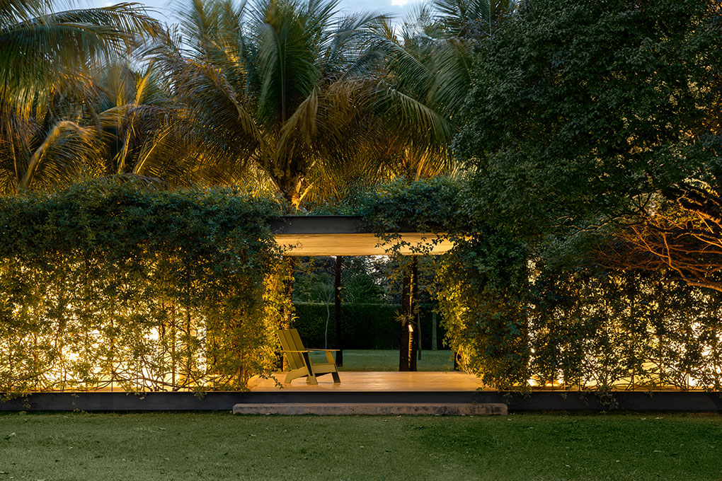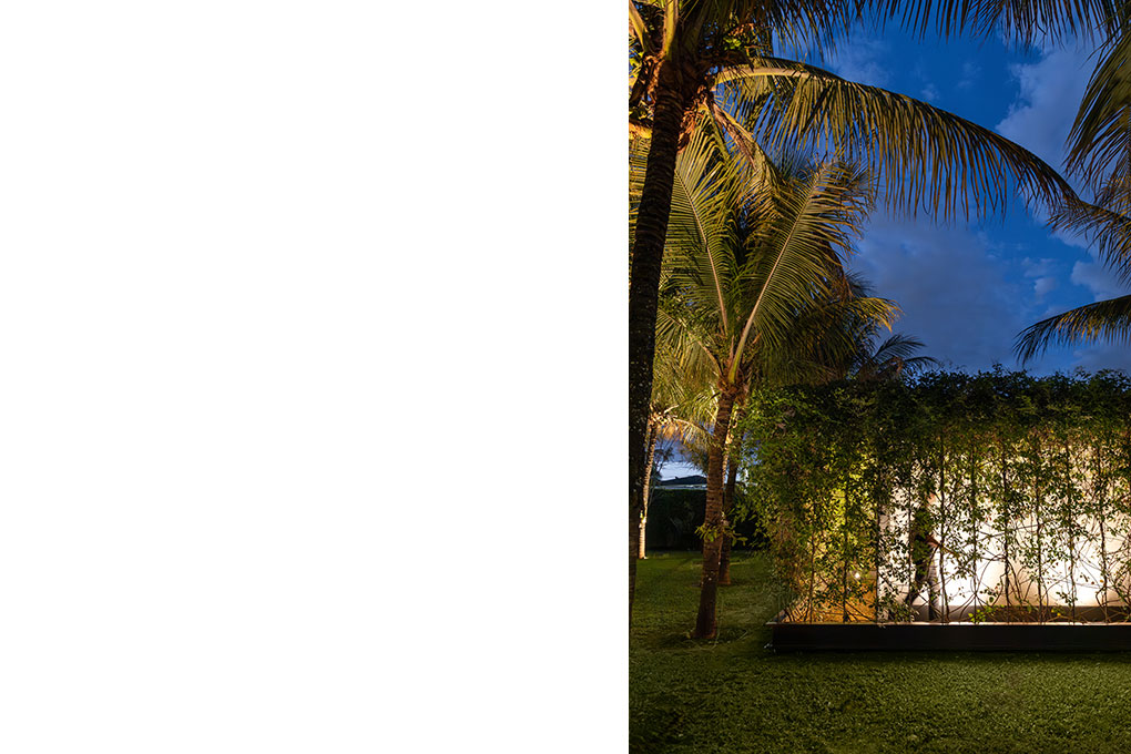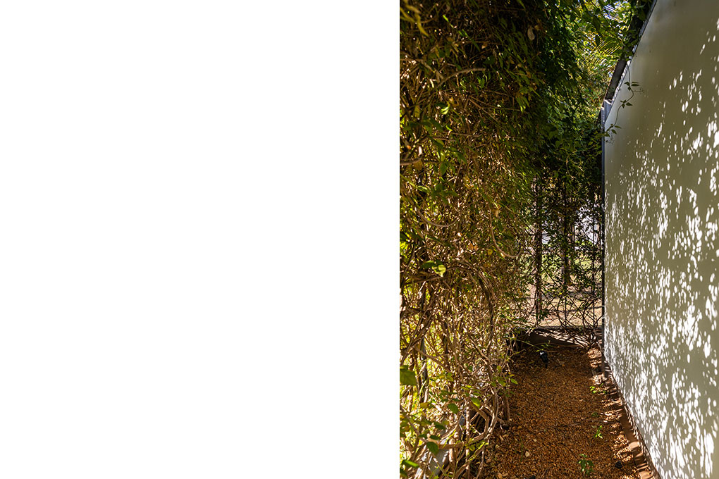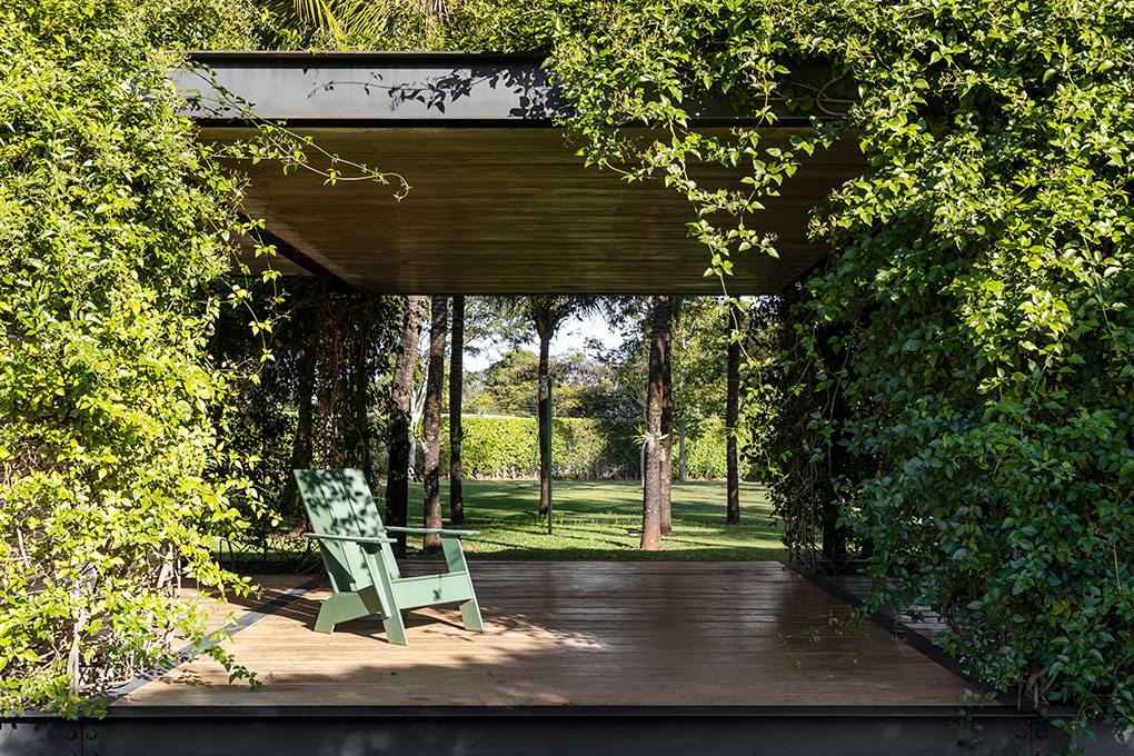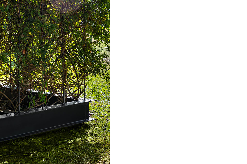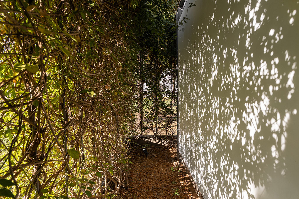 Uma malha de perfis metálicos laminados (solta do núcleo construído e suspensa levemente do chão) acopla cabos verticais, circunda a área edificada no interior e funciona como suporte para o crescimento de trepadeiras do tipo “Jasmim dos Açores” que protegem a construção da insolação excessiva e ajudam a integrá-la de forma discreta ao jardim.