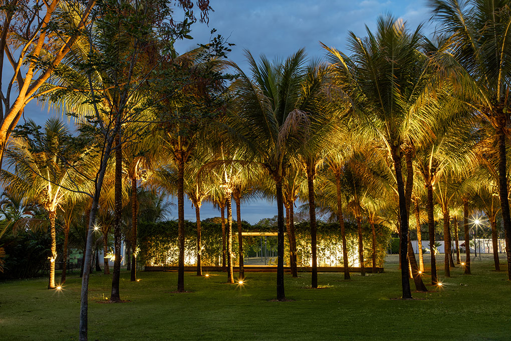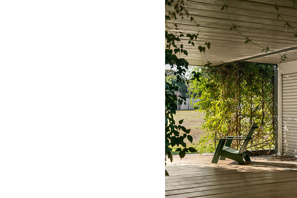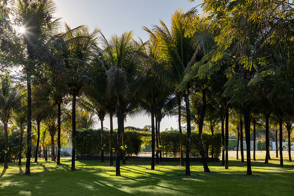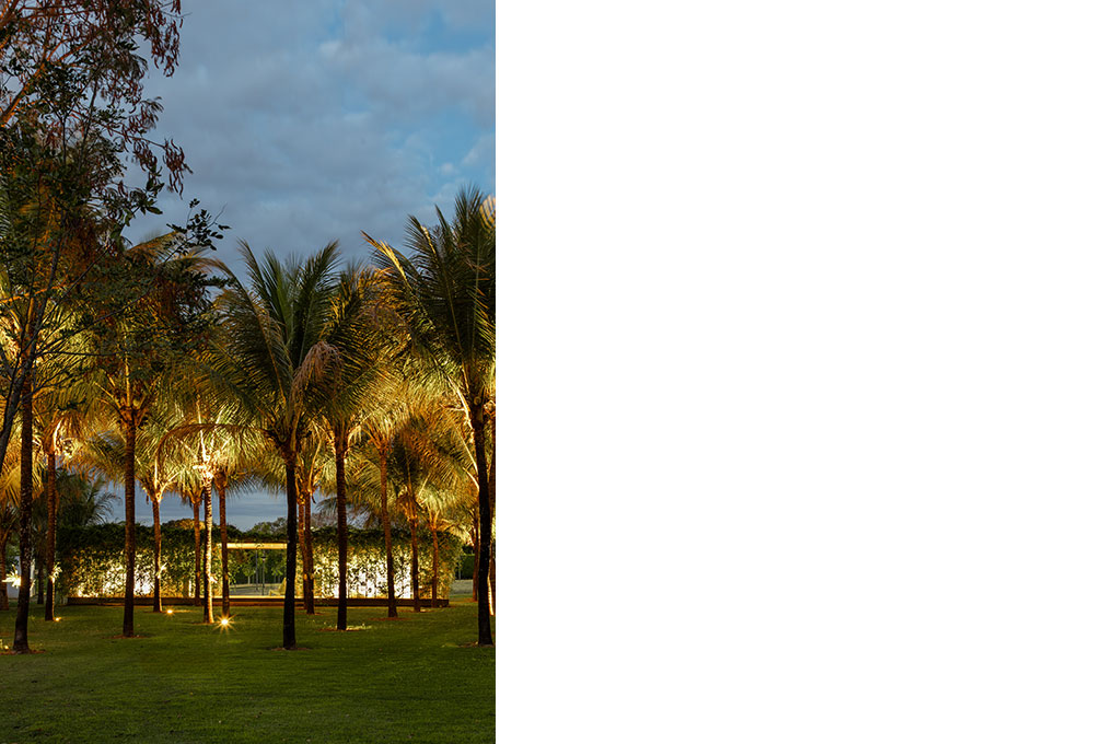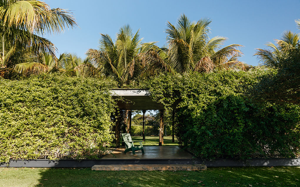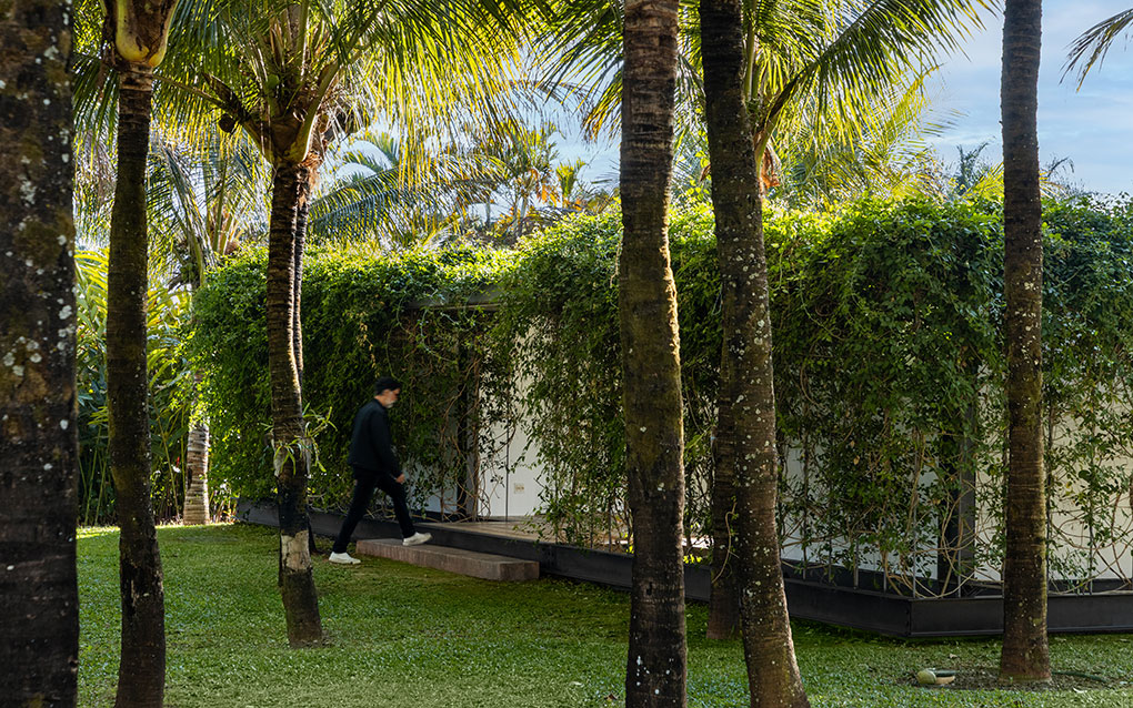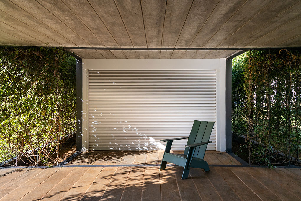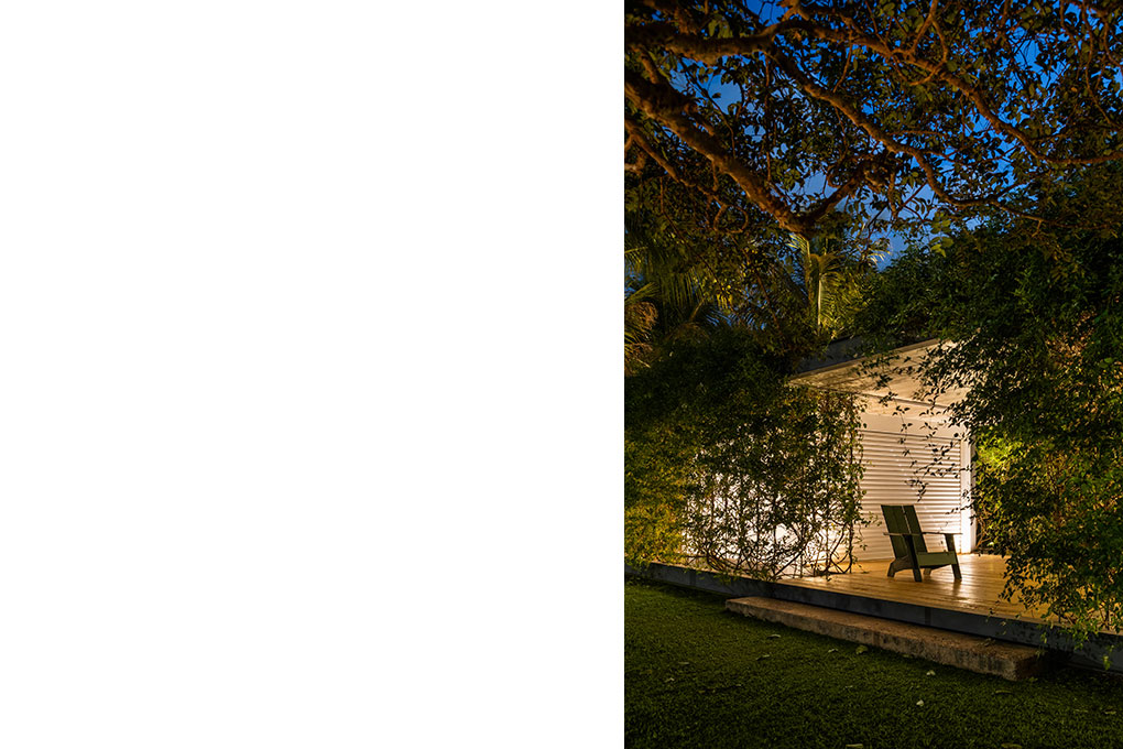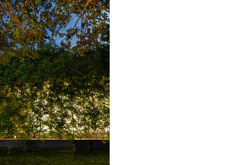 Uma malha de perfis metálicos laminados (solta do núcleo construído e suspensa levemente do chão) acopla cabos verticais, circunda a área edificada no interior e funciona como suporte para o crescimento de trepadeiras do tipo “Jasmim dos Açores” que protegem a construção da insolação excessiva e ajudam a integrá-la de forma discreta ao jardim.