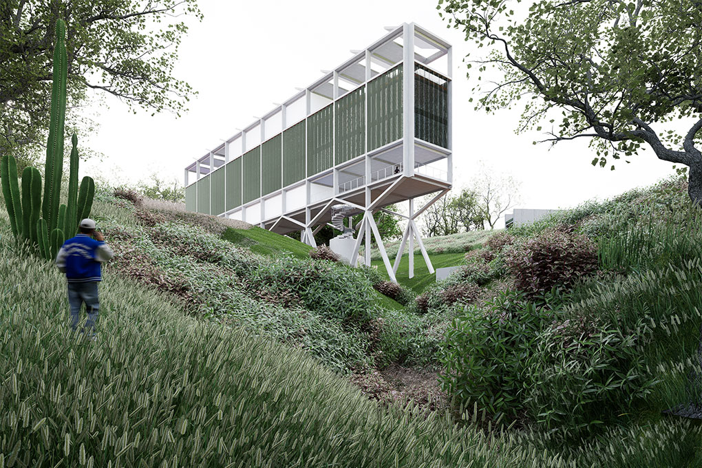 O edifício servirá como a casa da associação de moradores, além de abrigar pequenos auditórios, serviços de apoio, a administração da RPPN e um espaço para uma pequena escola ambiental. A esse programa, nós propusemos adicionar mirantes para a paisagem e apoio para ciclistas e pedestres que desejarem iniciar a caminhada pelas várias trilhas que se iniciarão por ali. Um dos mirantes, no térreo, aproximará o visitante à copa das árvores ao redor. Na cobertura, onde a vista para o horizonte será desimpedida, grandes planos de concreto servirão de elementos de sombreamento e suporte para as placas de energia fotovoltaica que fornecerão eletricidade para grande parte do conjunto. No térreo, seus pilares de apoio se adaptam à topografia existente através de um “piloti natural”, onde o piso será a própria topografia do terreno, coberto pela vegetação típica do cerrado.