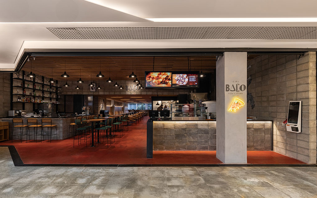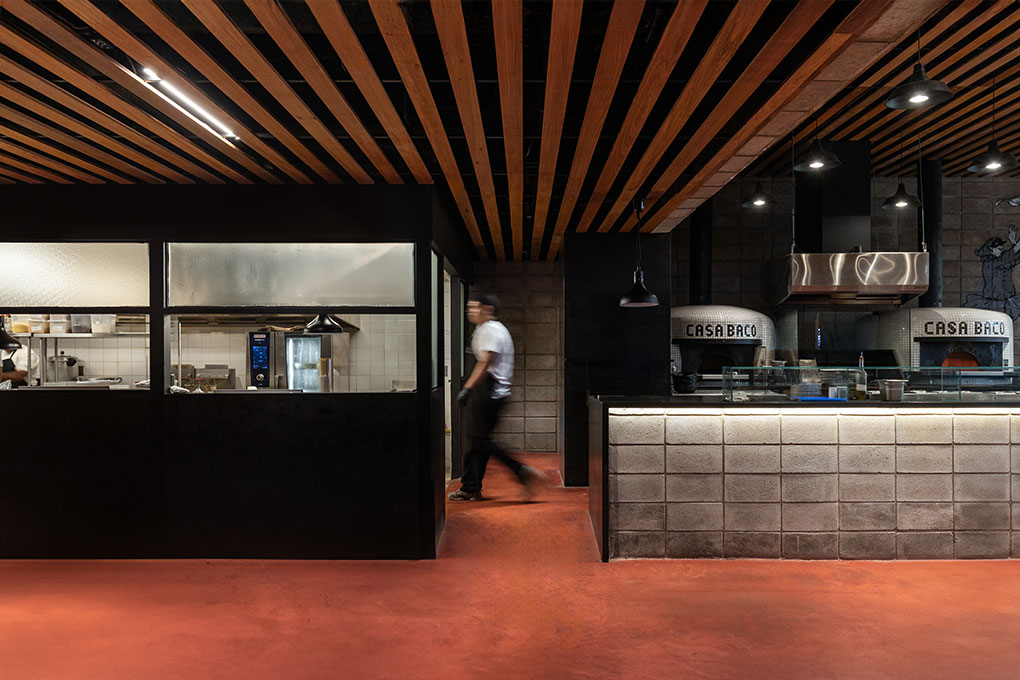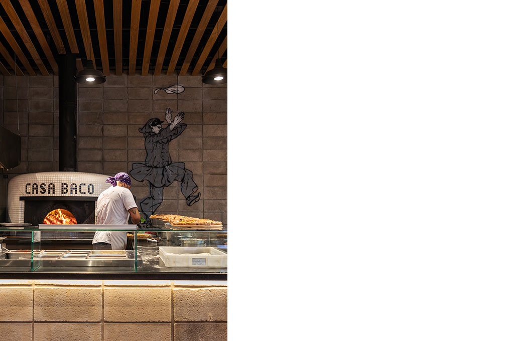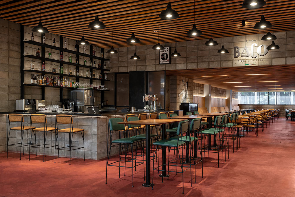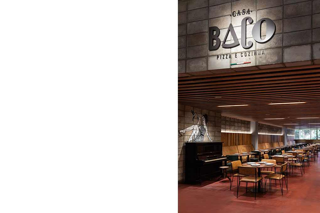 O piso em cimento queimado no tom avermelhado, conhecido como “vermelhão”, tornou-se uma das assinaturas visuais da Casa Baco e segue presente nesta nova unidade, permeando todos os ambientes e conectando visualmente os espaços. Entre os destaques do projeto estão a cozinha aberta e o balcão de pizza por fatia, que aproximam o preparo dos alimentos do público e tornam a experiência gastronômica mais transparente, interativa e informal.