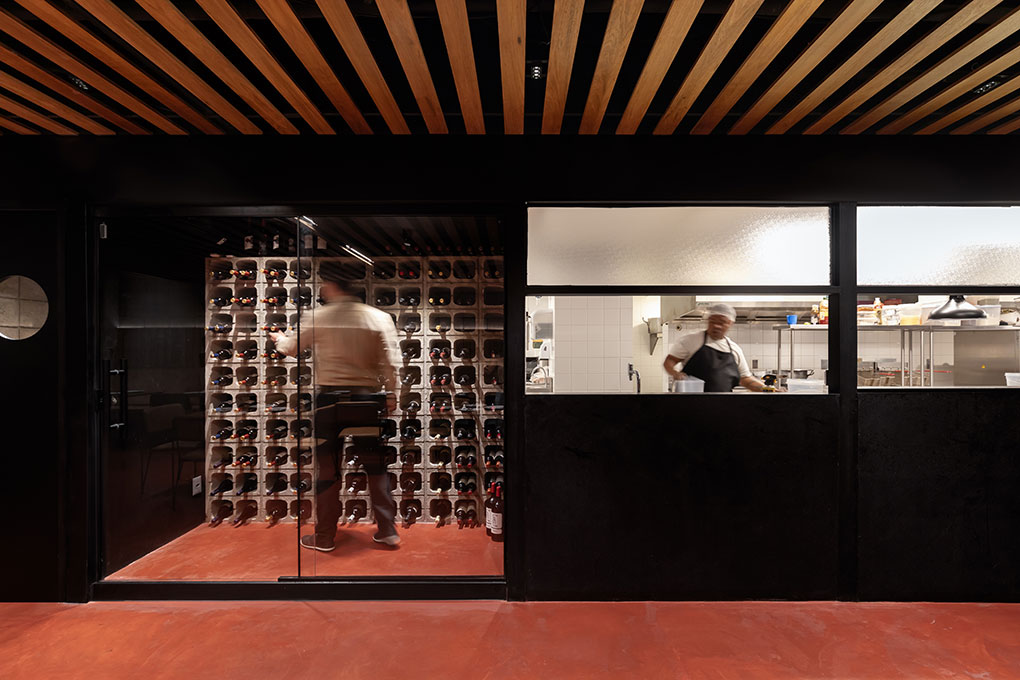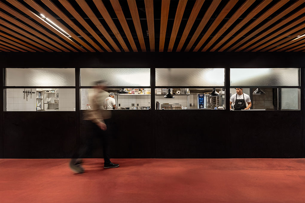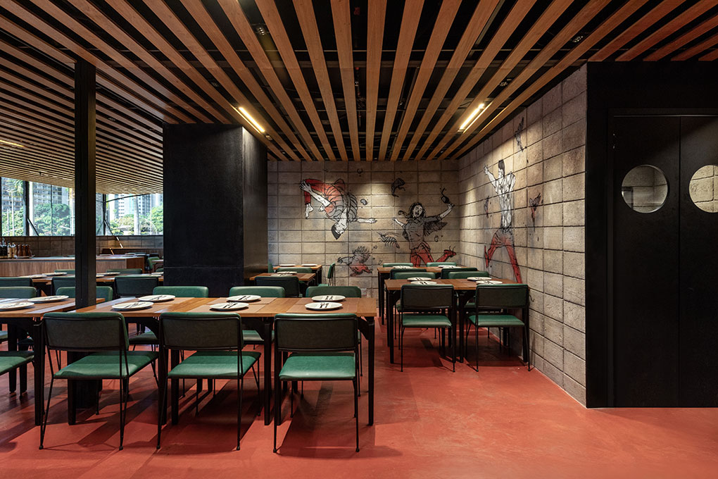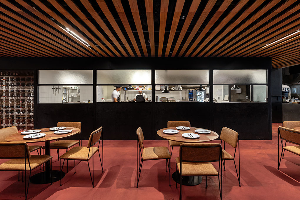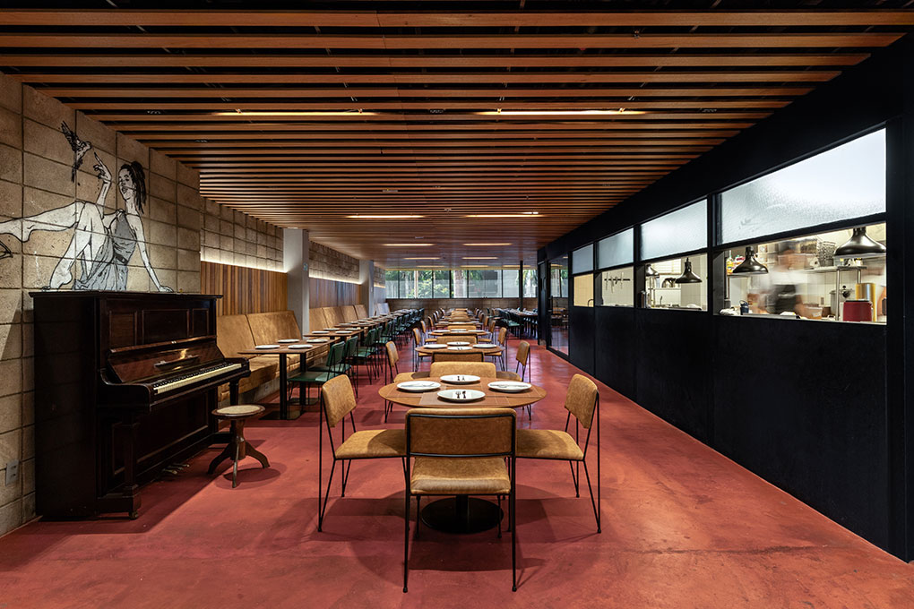 O piso em cimento queimado no tom avermelhado, conhecido como “vermelhão”, tornou-se uma das assinaturas visuais da Casa Baco e segue presente nesta nova unidade, permeando todos os ambientes e conectando visualmente os espaços. Entre os destaques do projeto estão a cozinha aberta e o balcão de pizza por fatia, que aproximam o preparo dos alimentos do público e tornam a experiência gastronômica mais transparente, interativa e informal.