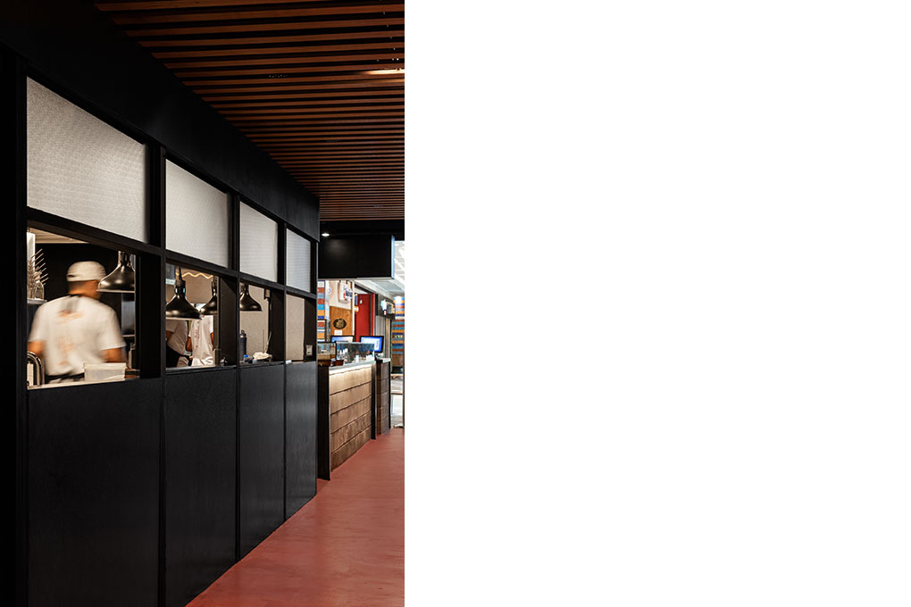 Instalada na praça de alimentação do shopping, a loja foi pensada para estabelecer relações visuais tanto com o interior da praça quanto com o espaço externo do edifício. Essa abertura favorece a entrada de luz natural durante o dia, criando um ambiente iluminado, agradável e acolhedor, mesmo em meio à dinâmica intensa de um centro comercial.
