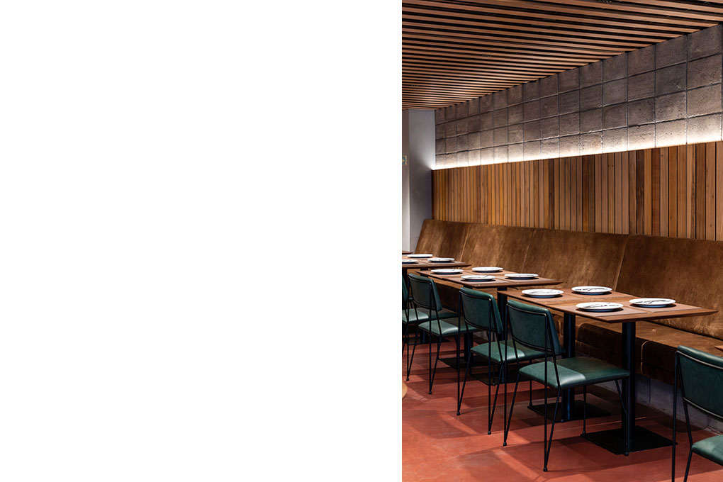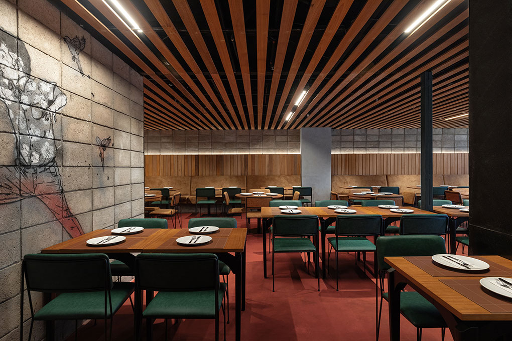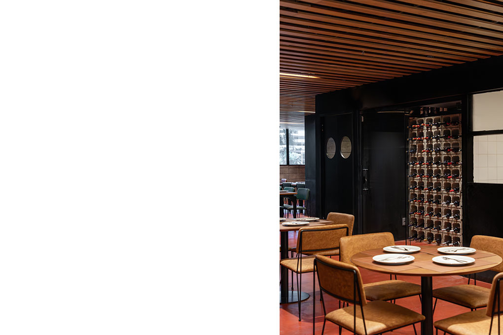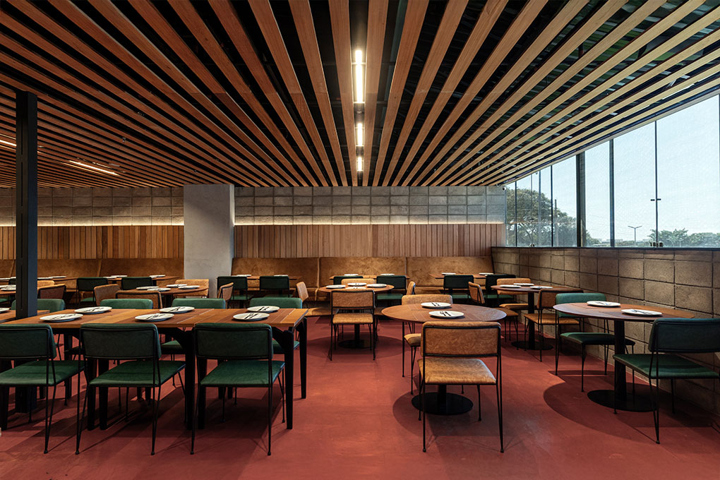 A segunda unidade do restaurante Casa Baco, agora localizada no Brasília Shopping, dá continuidade à linguagem arquitetônica da primeira loja. O projeto preserva a identidade visual da marca, valorizando elementos brutos, materiais aparentes e uma atmosfera acolhedora. Assim como na unidade original, o bloco de concreto aparente foi mantido nas paredes internas, conferindo uma estética urbana, crua e contemporânea. O forro de madeira, presente em todo o salão em duas alturas distintas, cria uma composição dinâmica e ao mesmo tempo aconchegante, reforçando o caráter direto e honesto da construção.