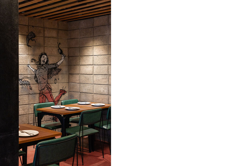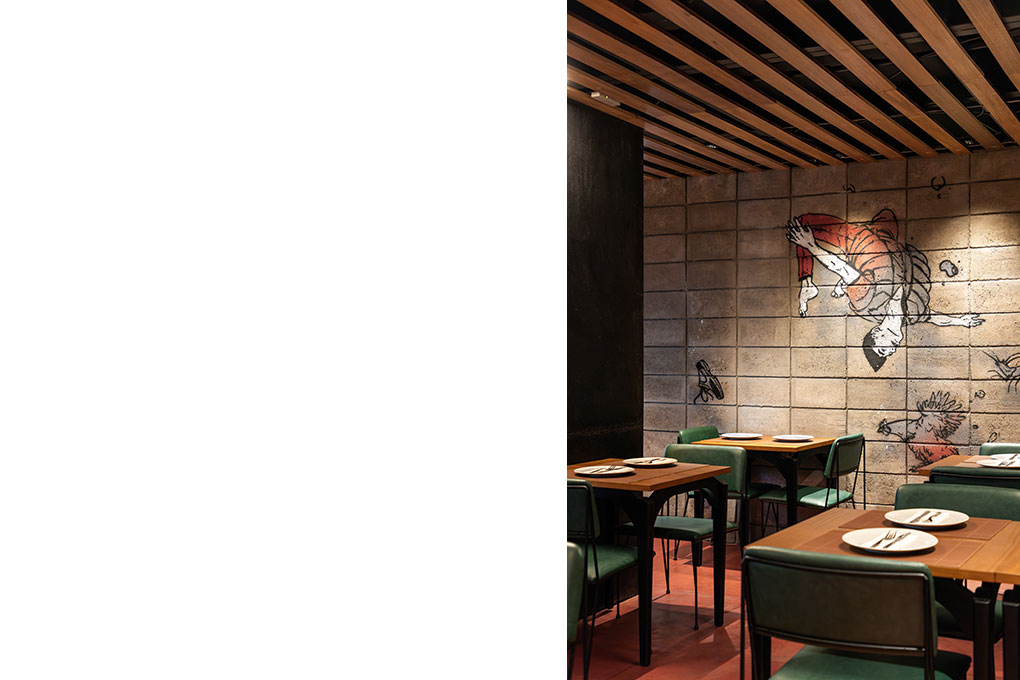 O mobiliário do restaurante reforça a estética industrial do projeto, com peças cuidadosamente escolhidas para dialogar com os demais materiais. As cadeiras e banquetas em aço carbono, com estofados em couro, somam-se a mesas de tampo em madeira natural, equilibrando rusticidade e conforto. Um grande sofá tipo booth, posicionado ao longo da maior extensão do salão, organiza o espaço e convida à permanência, reforçando o compromisso do projeto com a funcionalidade e o bem-estar dos clientes.