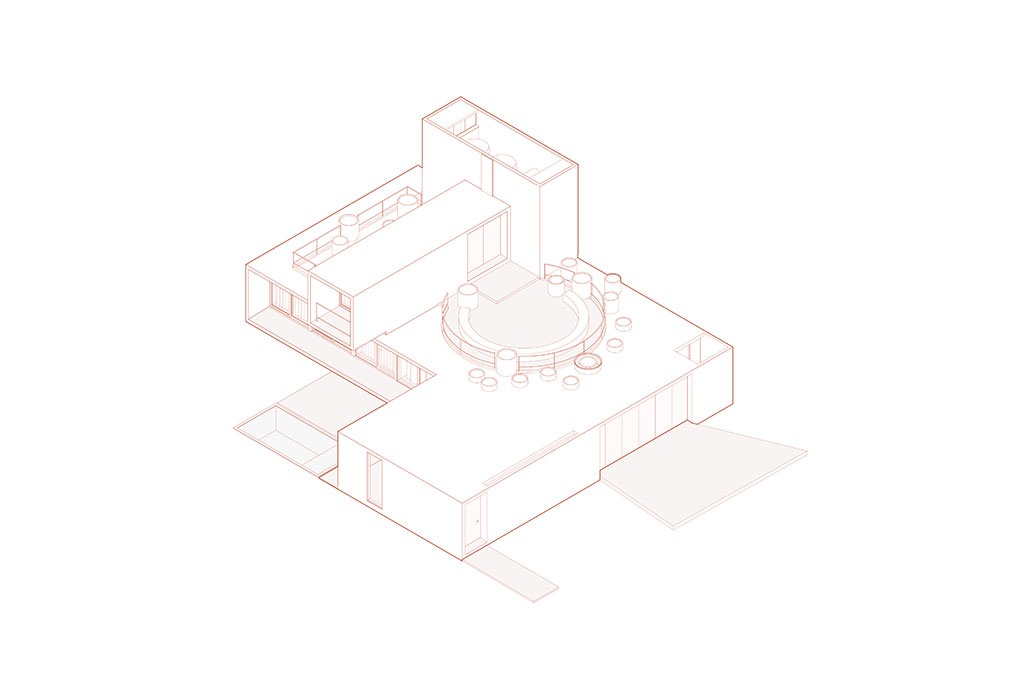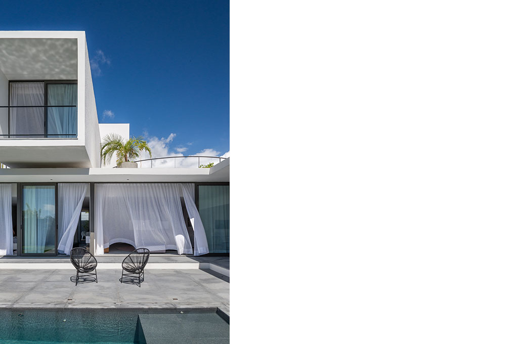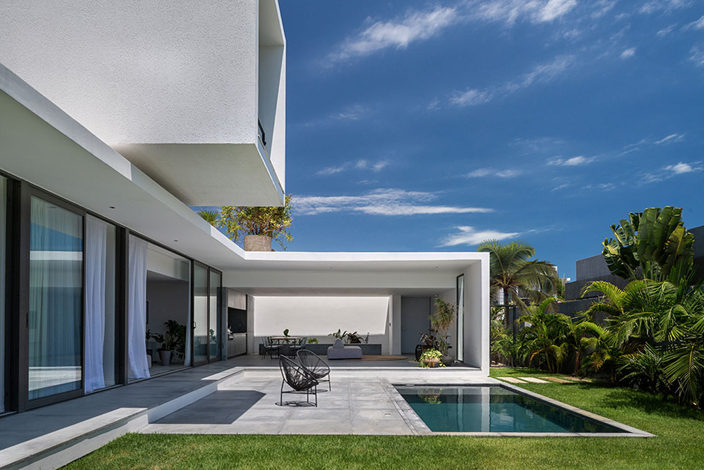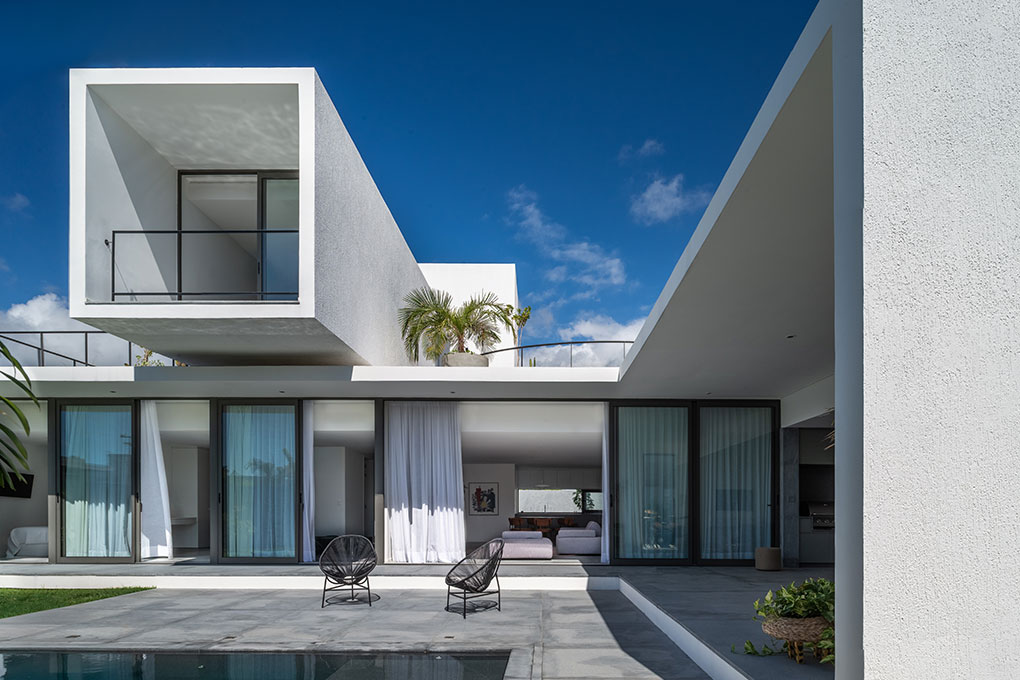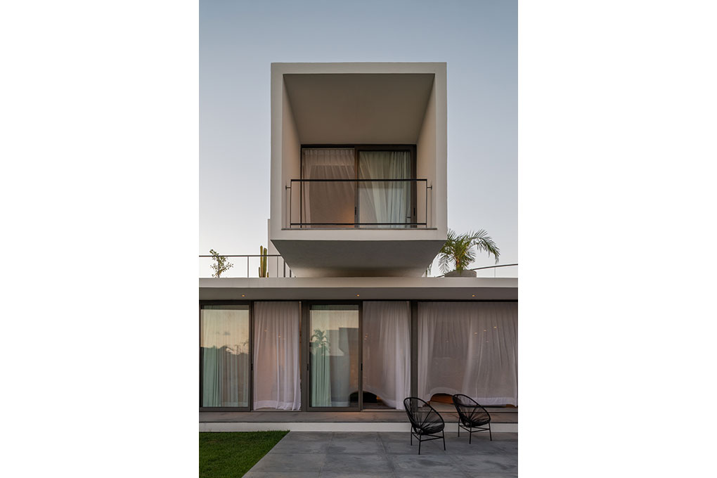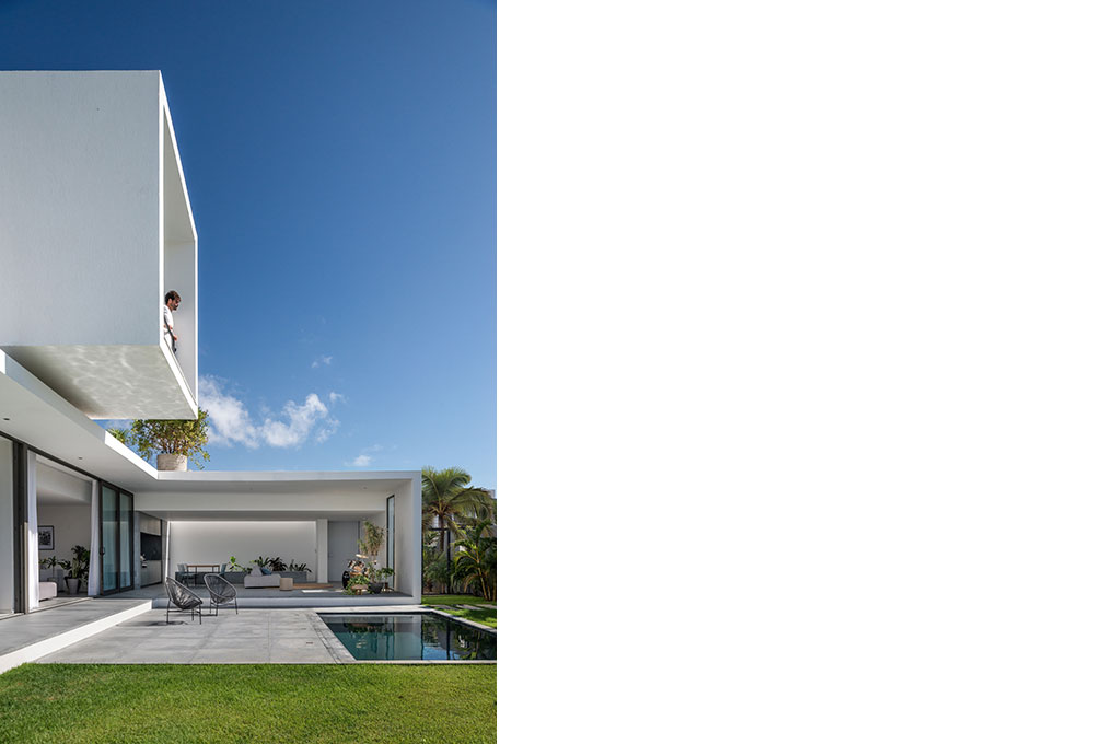 The house is located in a gated community on the southern waterfront of Aracaju, in a setting removed from urban dynamics. In response, we proposed a house oriented toward the interior of the lot. With nearly identical width and depth, the site led to the layout of the program in an “L” shape, shifting the backyard—traditionally placed at the rear—to the center of the plot. This central space, which receives the morning sun, is enclosed by the house itself and by the surrounding walls, forming a courtyard with a swimming pool onto which the bedrooms, verandas, living room, and kitchen open. On the upper floor, the office volume projects over the courtyard toward the rising sun, offering unobstructed views of the sky above Gameleira Beach, near the entrance to the condominium. The circulation leading to the office also connects two open terraces.