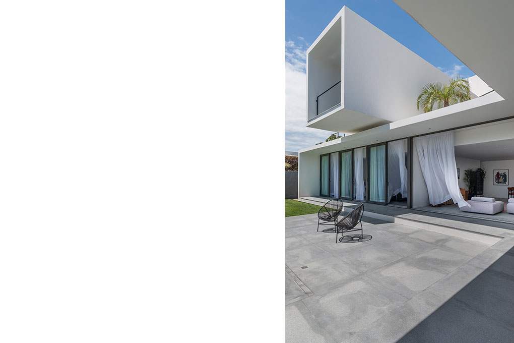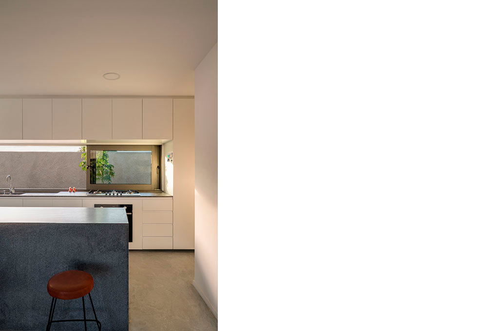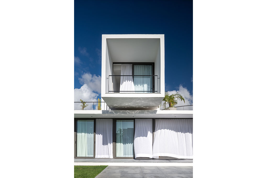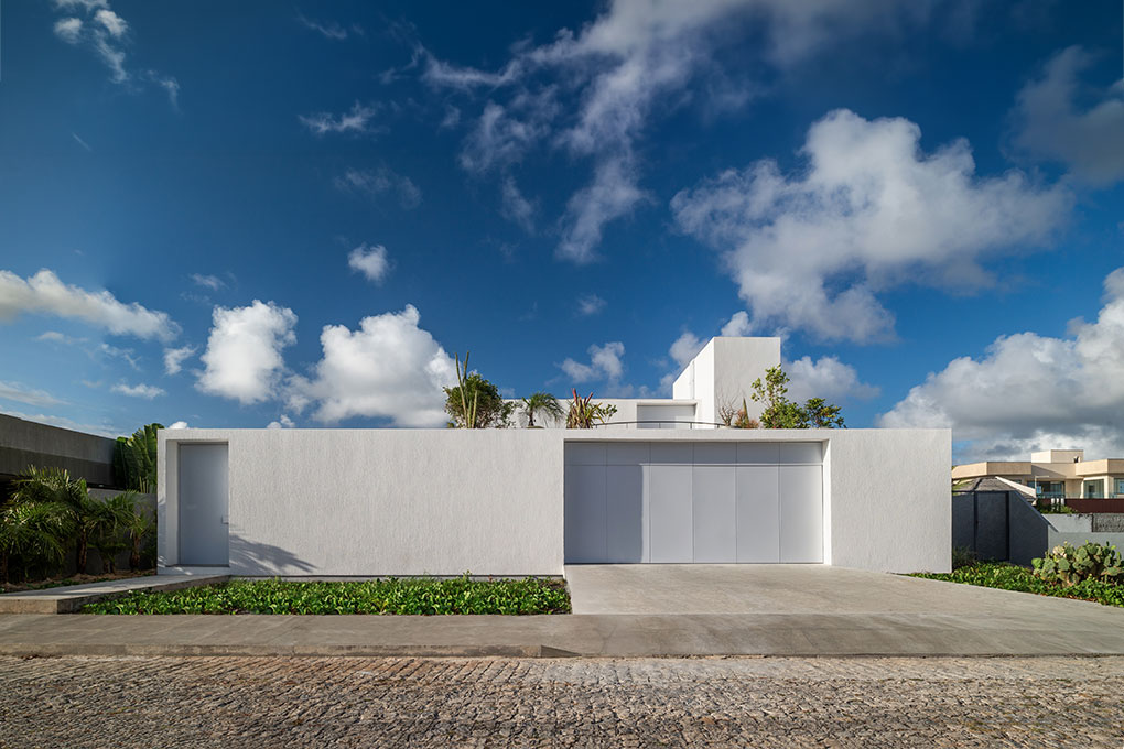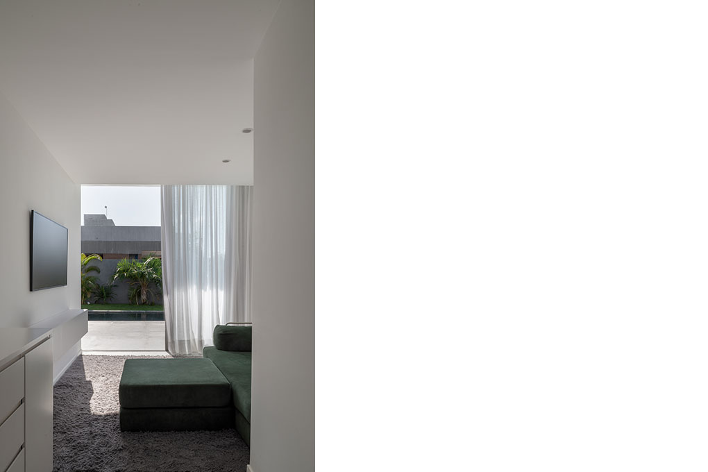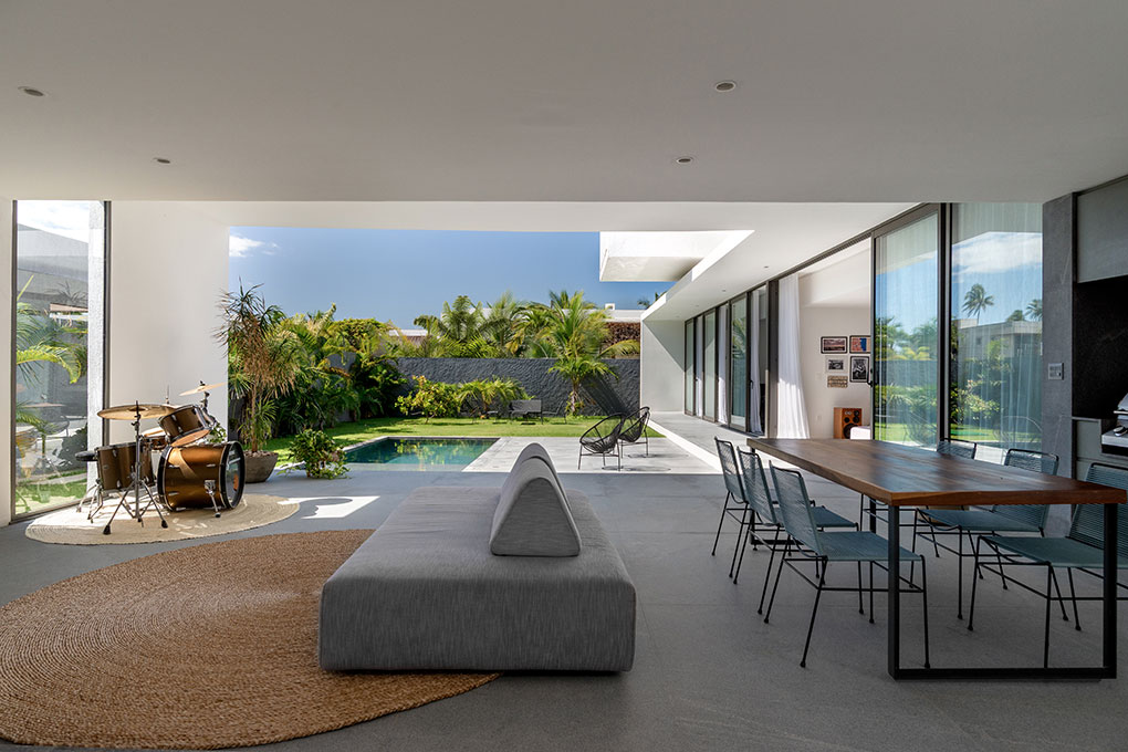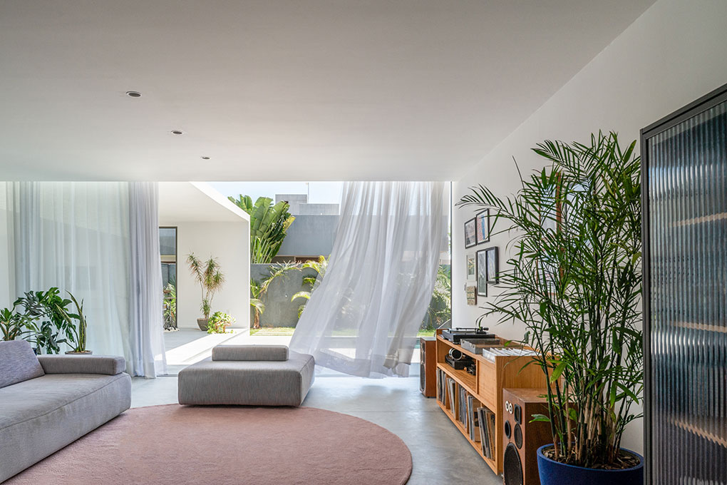 Aracaju’s hot climate, marked by the constant presence of winds, influences the organization of the spaces. As in many houses in the city, part of the living room functions as an open veranda, without window frames, facing the courtyard. Most of the house’s openings are oriented toward the morning sun, with the exception of the horizontal kitchen window and the side access points of the lot. The few openings facing the street (pedestrian entrance, garage, and office circulation) are protected by opaque doors in a tone close to the predominant white.