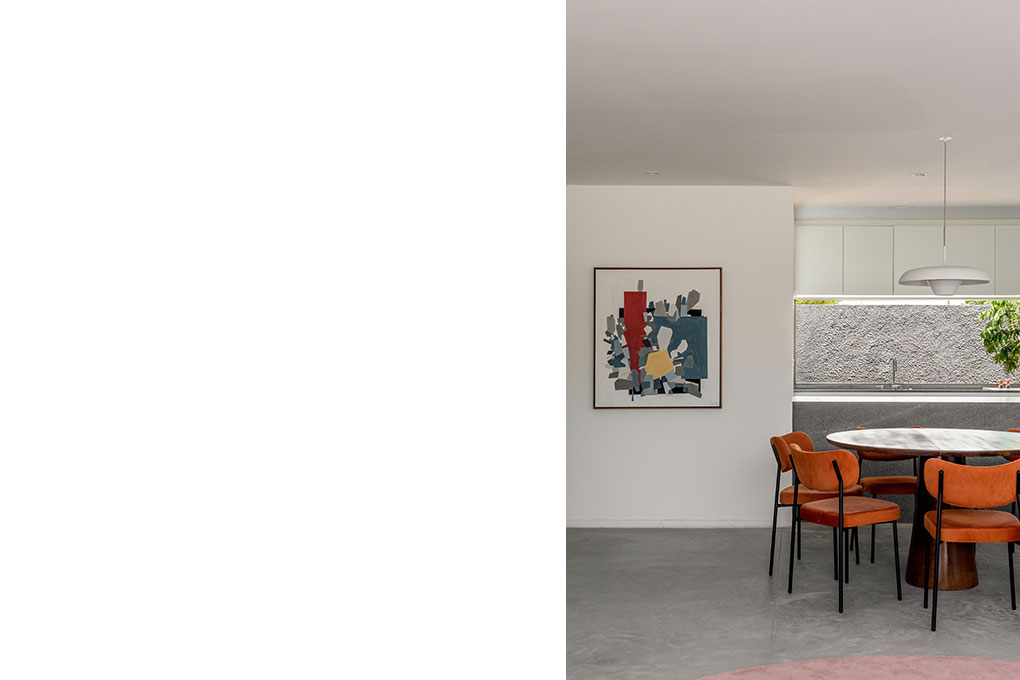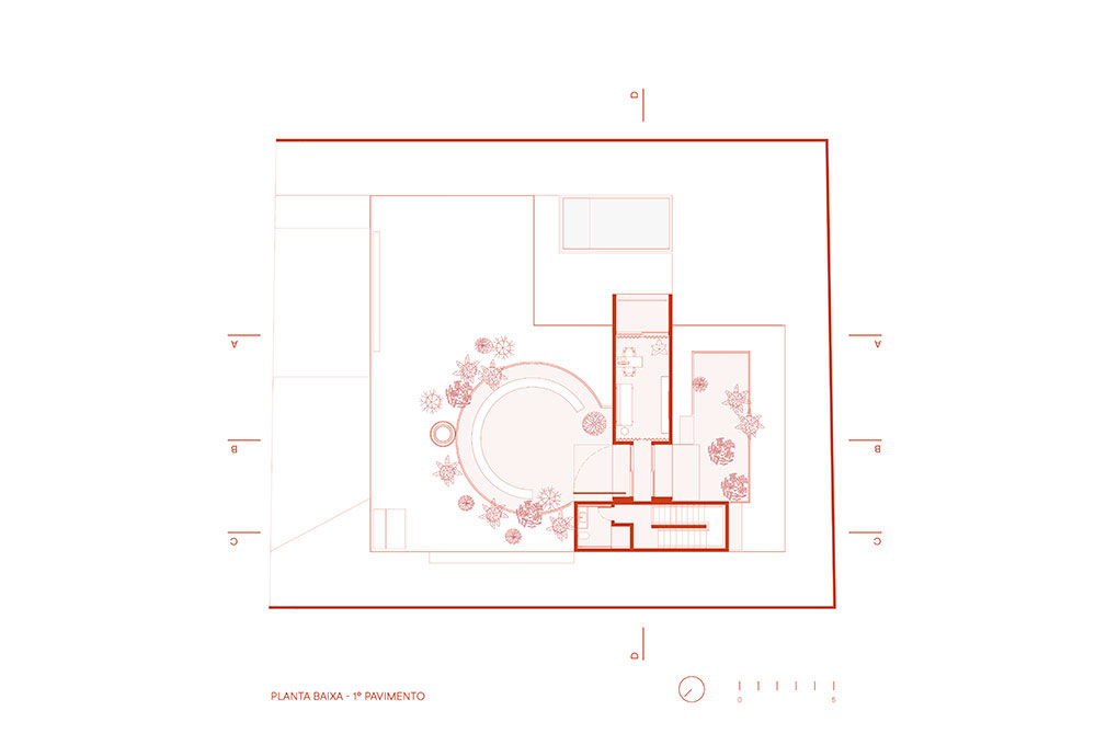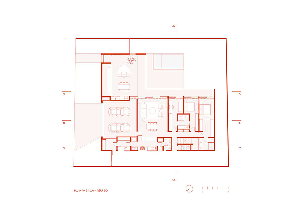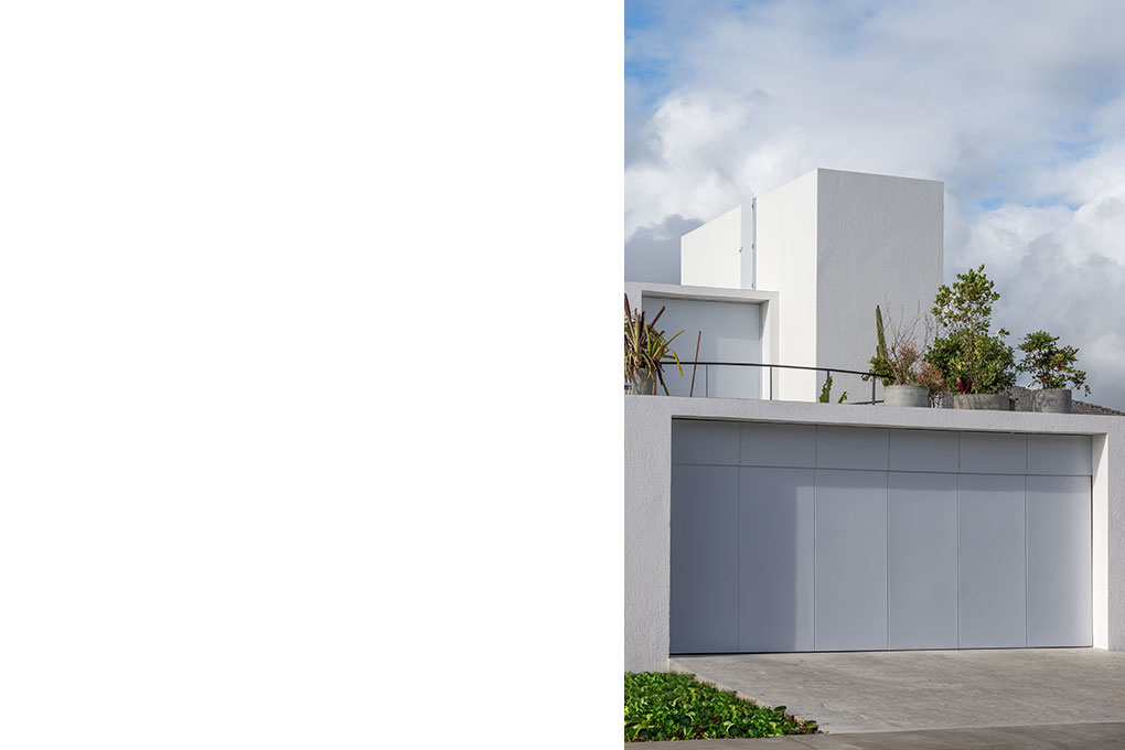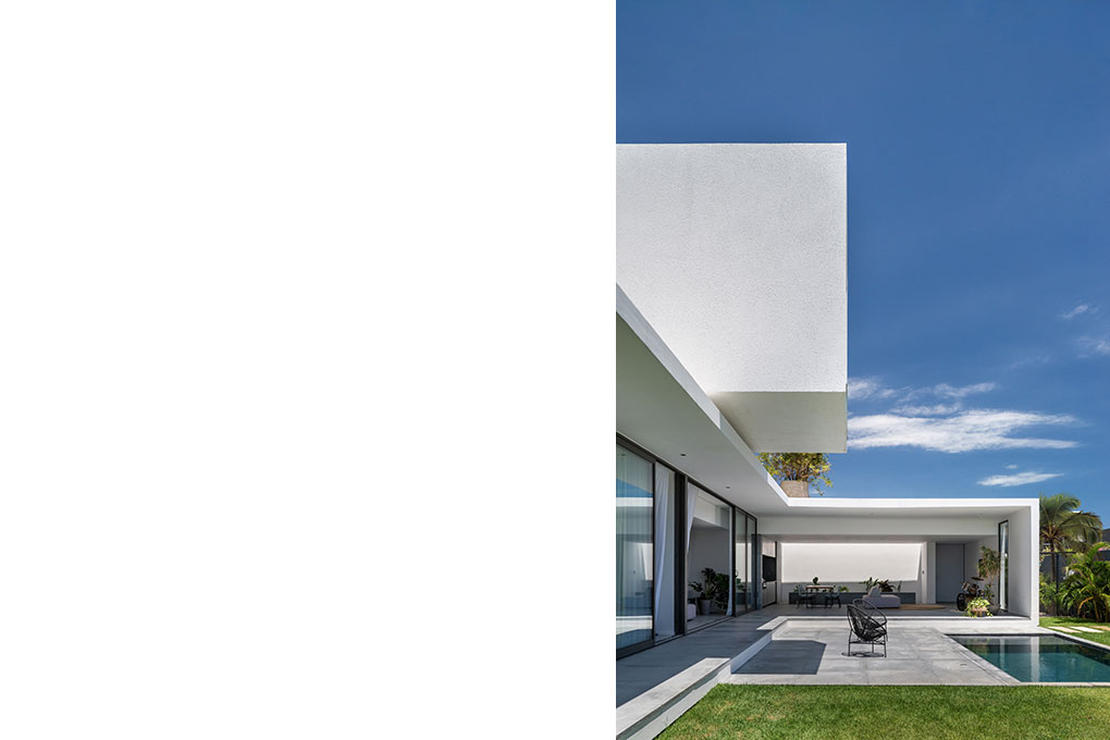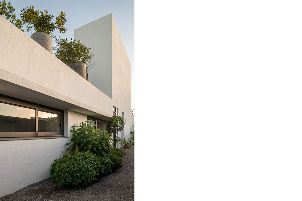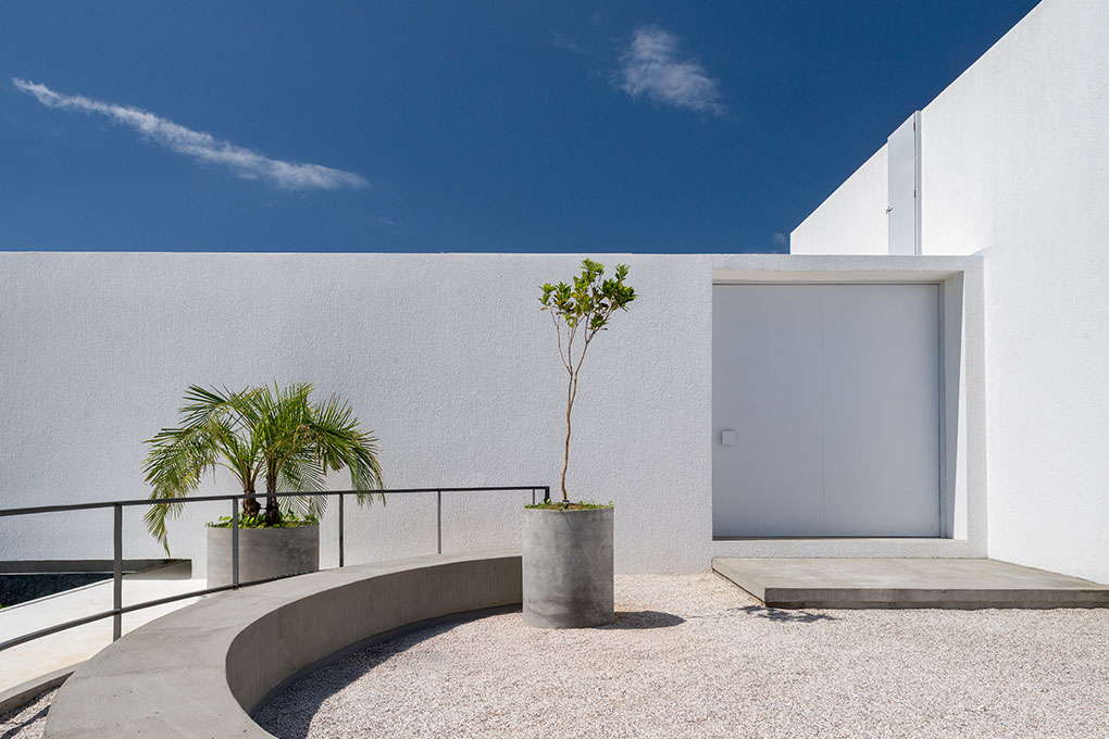 Aracaju’s hot climate, marked by the constant presence of winds, influences the organization of the spaces. As in many houses in the city, part of the living room functions as an open veranda, without window frames, facing the courtyard. Most of the house’s openings are oriented toward the morning sun, with the exception of the horizontal kitchen window and the side access points of the lot. The few openings facing the street (pedestrian entrance, garage, and office circulation) are protected by opaque doors in a tone close to the predominant white.