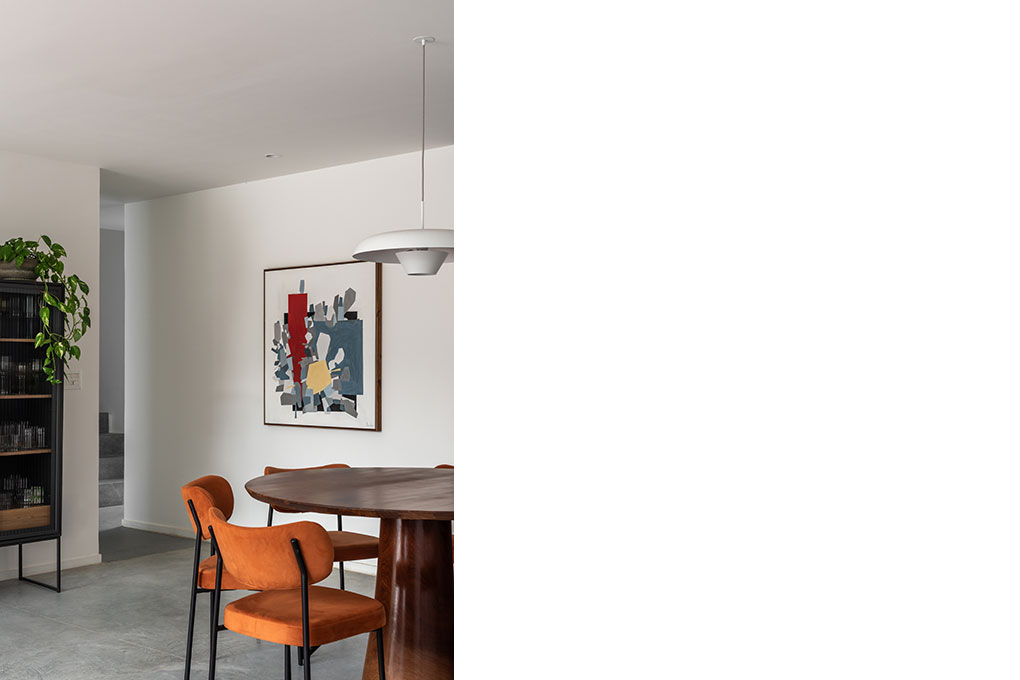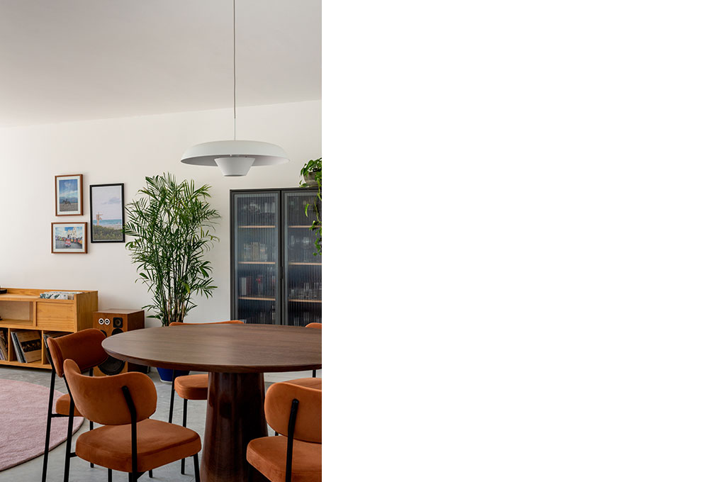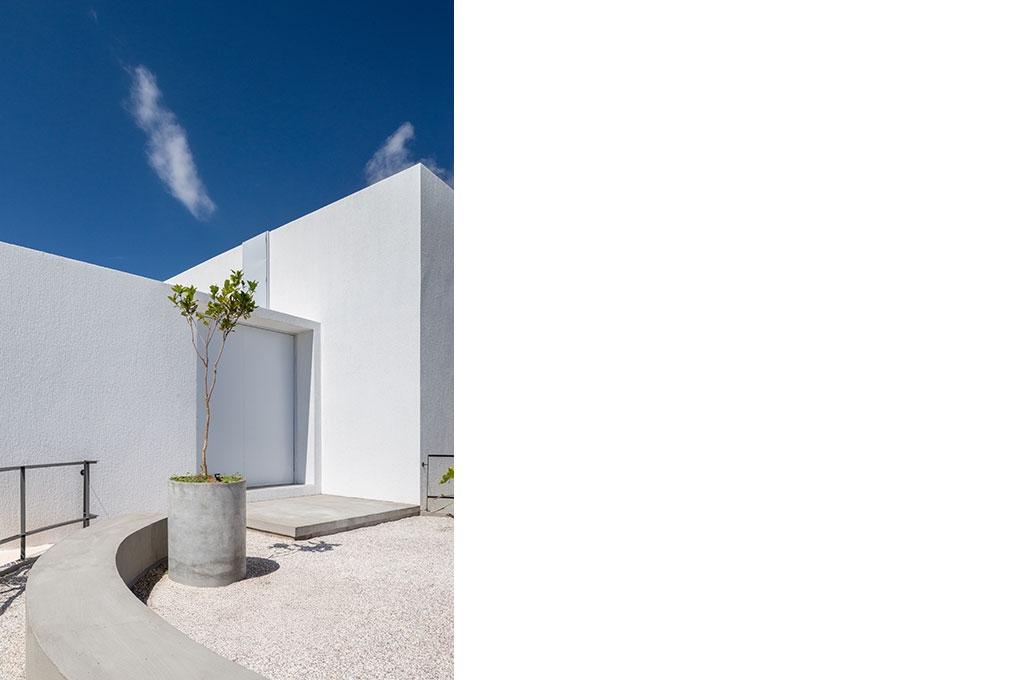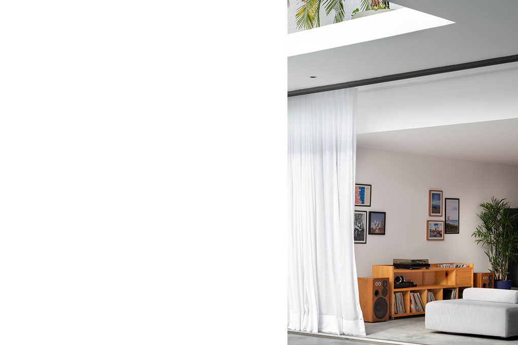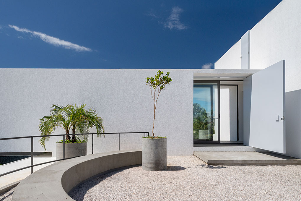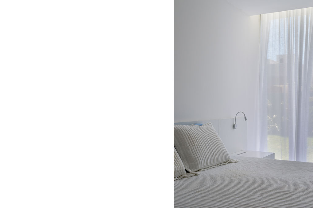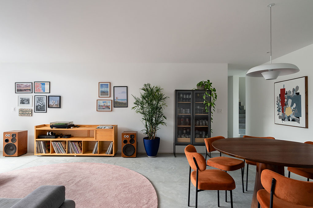 Aracaju’s hot climate, marked by the constant presence of winds, influences the organization of the spaces. As in many houses in the city, part of the living room functions as an open veranda, without window frames, facing the courtyard. Most of the house’s openings are oriented toward the morning sun, with the exception of the horizontal kitchen window and the side access points of the lot. The few openings facing the street (pedestrian entrance, garage, and office circulation) are protected by opaque doors in a tone close to the predominant white.