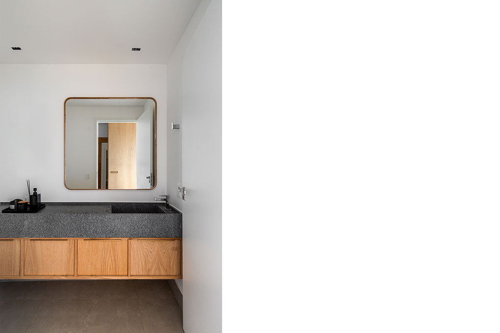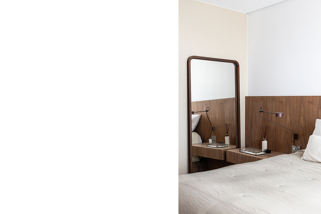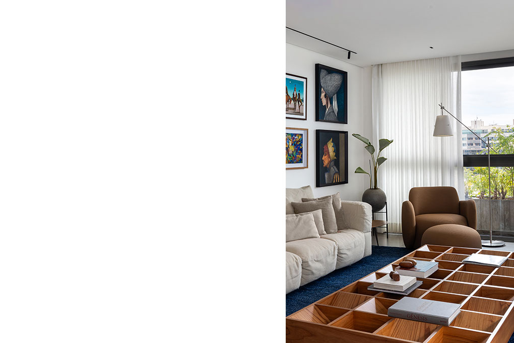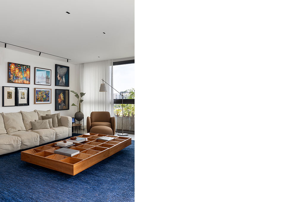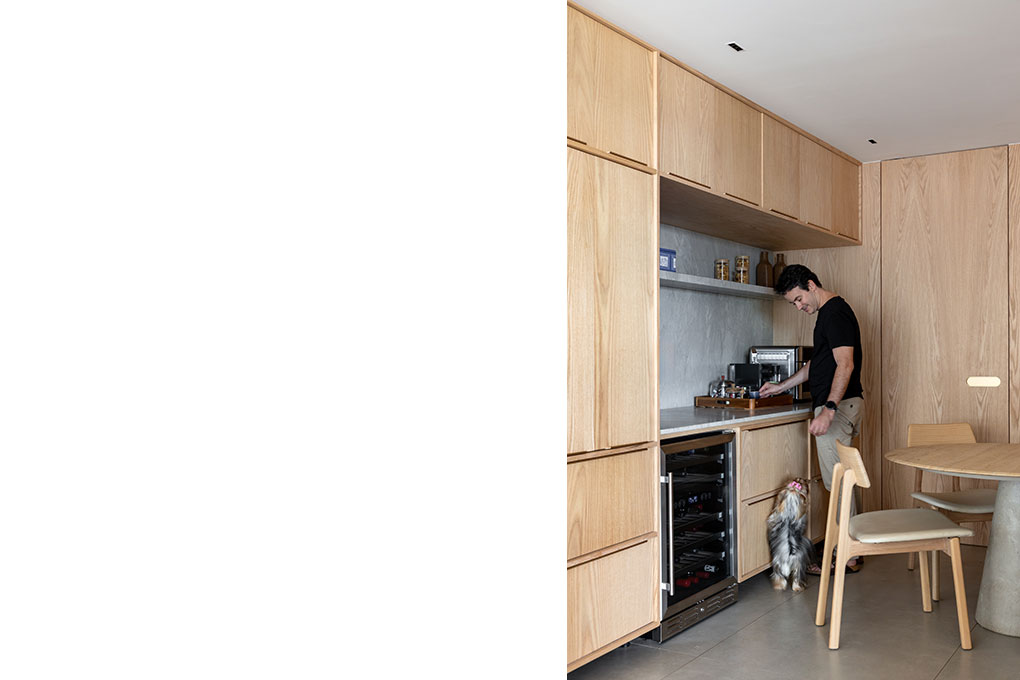 Desde o início, os clientes manifestaram o desejo de realizar intervenções mínimas na planta original, com a qual já se identificavam. Essa premissa norteou as decisões de projeto, priorizando soluções que respeitassem o layout existente. O partido do projeto consistiu em valorizar os generosos espaços do apartamento, potencializando a amplitude existente. Com o piso em porcelanato de tom cinza neutro já presente, optou-se por introduzir elementos de marcenaria e parte do mobiliário em madeira clara, com o objetivo de equilibrar o conjunto de materiais e conferir maior sensação de aconchego ao conjunto. A iluminação natural, um dos atributos mais relevantes do imóvel, foi preservada e integrada às decisões de projeto, reforçando a atmosfera leve e acolhedora dos ambientes.