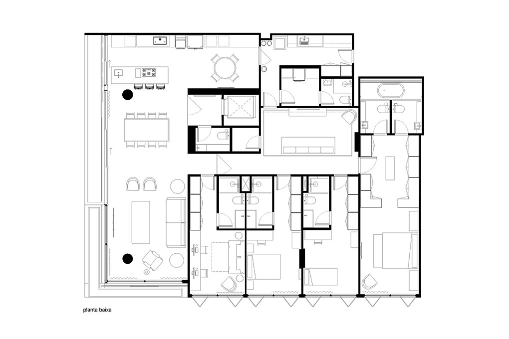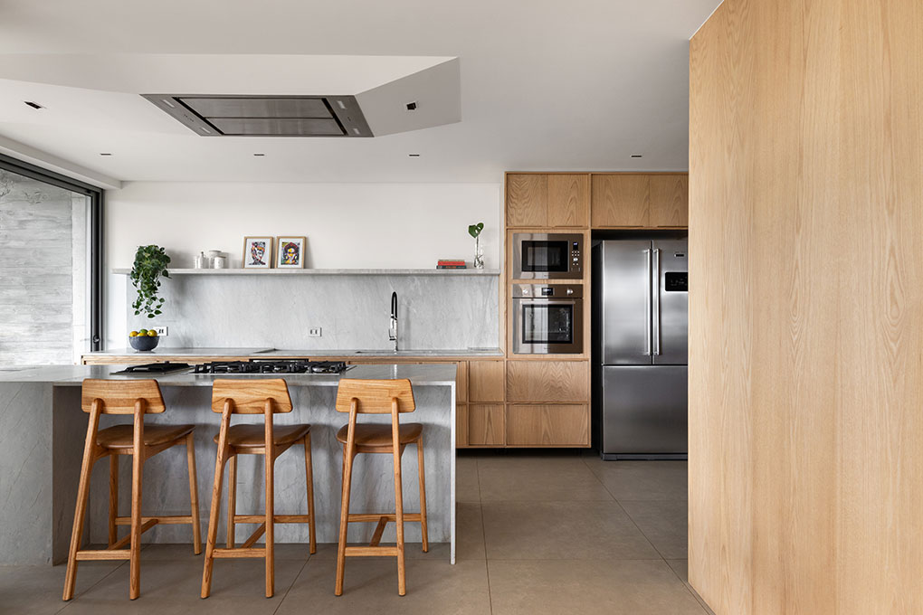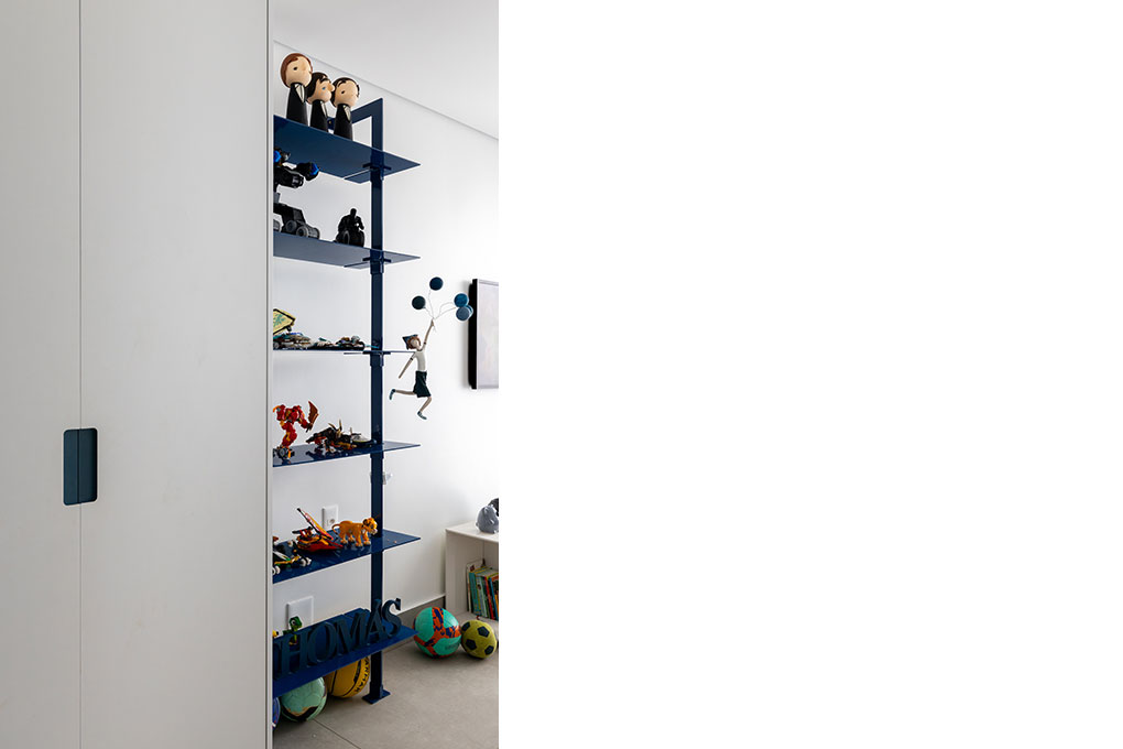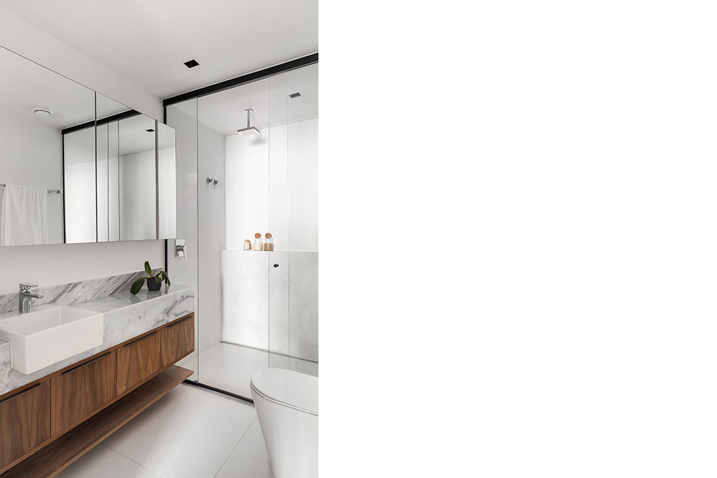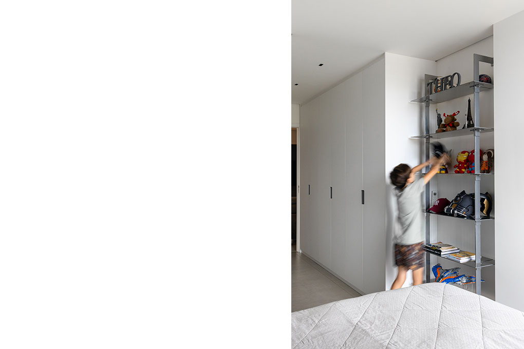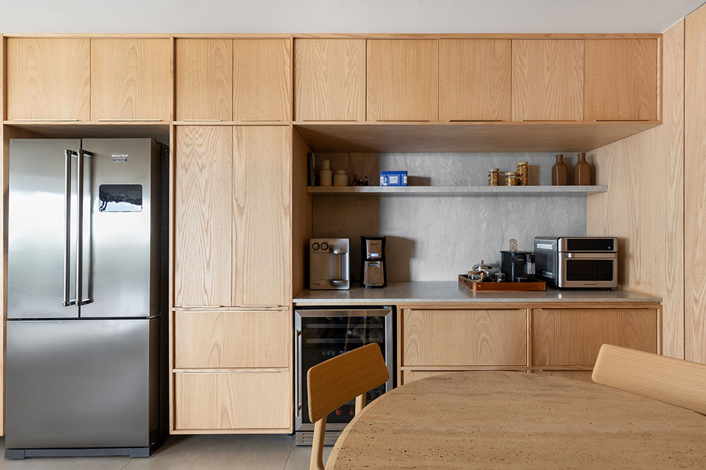 Desde o início, os clientes manifestaram o desejo de realizar intervenções mínimas na planta original, com a qual já se identificavam. Essa premissa norteou as decisões de projeto, priorizando soluções que respeitassem o layout existente. O partido do projeto consistiu em valorizar os generosos espaços do apartamento, potencializando a amplitude existente. Com o piso em porcelanato de tom cinza neutro já presente, optou-se por introduzir elementos de marcenaria e parte do mobiliário em madeira clara, com o objetivo de equilibrar o conjunto de materiais e conferir maior sensação de aconchego ao conjunto. A iluminação natural, um dos atributos mais relevantes do imóvel, foi preservada e integrada às decisões de projeto, reforçando a atmosfera leve e acolhedora dos ambientes.
