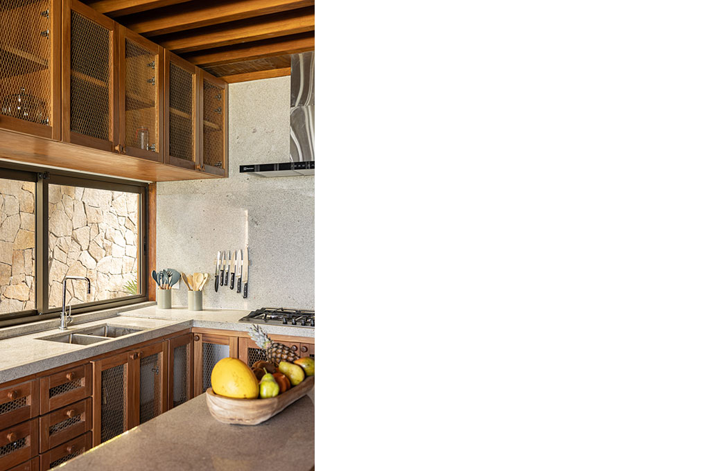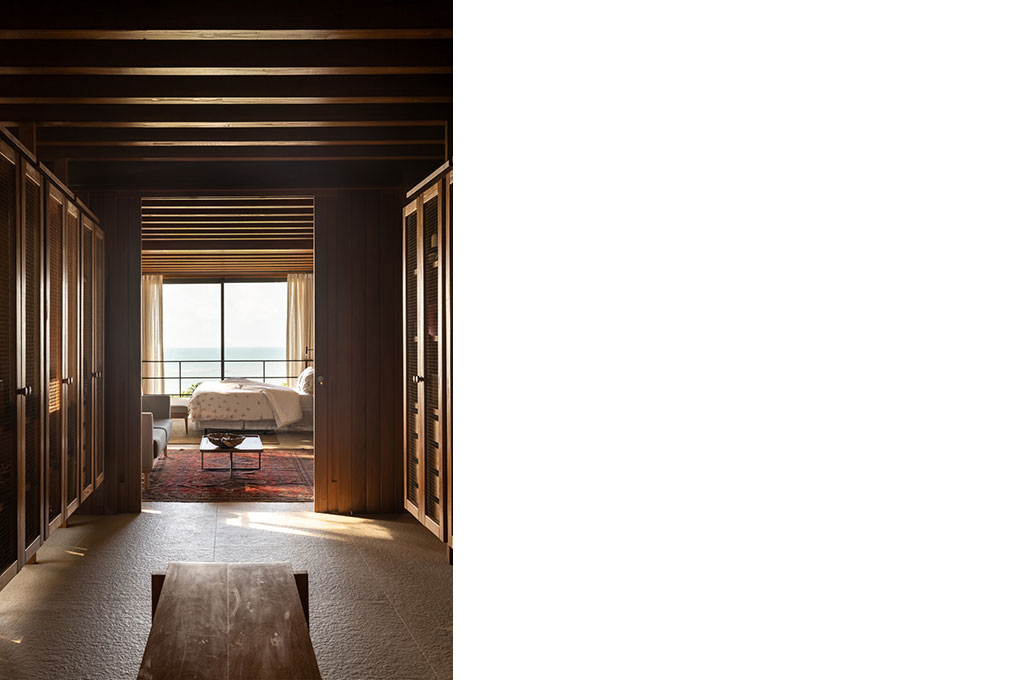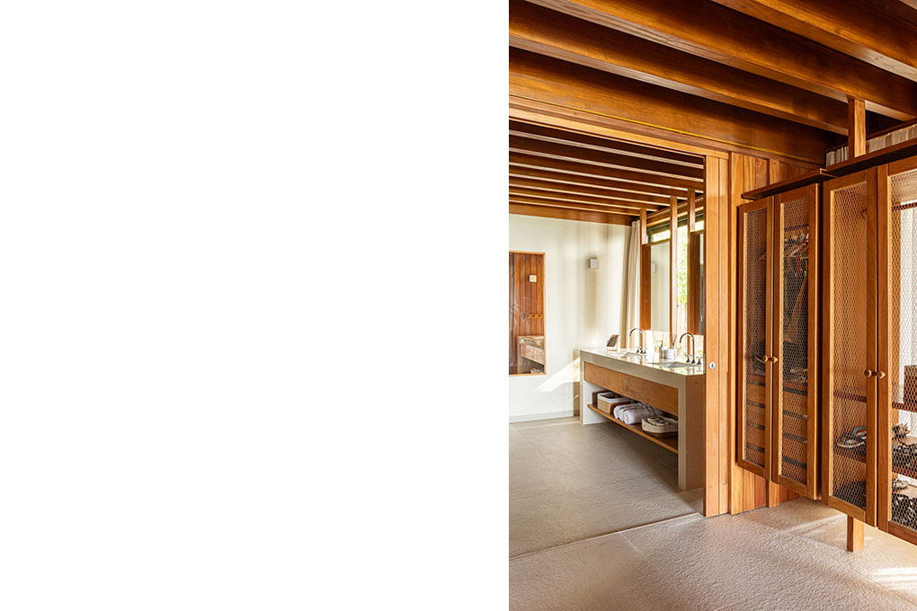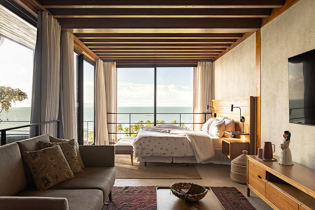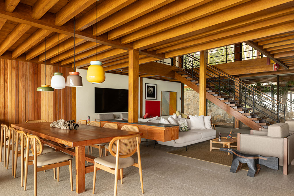 Implantada no alto de um talude de 15 metros, a casa fica próxima à praia de Itapororoca, em Trancoso, no sul da Bahia, Brasil, uma região de Mata Atlântica e com clima tropical úmido. Aproveitando a topografia natural, a implantação elevada proporciona vistas privilegiadas do mar e favorece a ventilação cruzada, reduzindo a necessidade de sistemas artificiais de climatização.