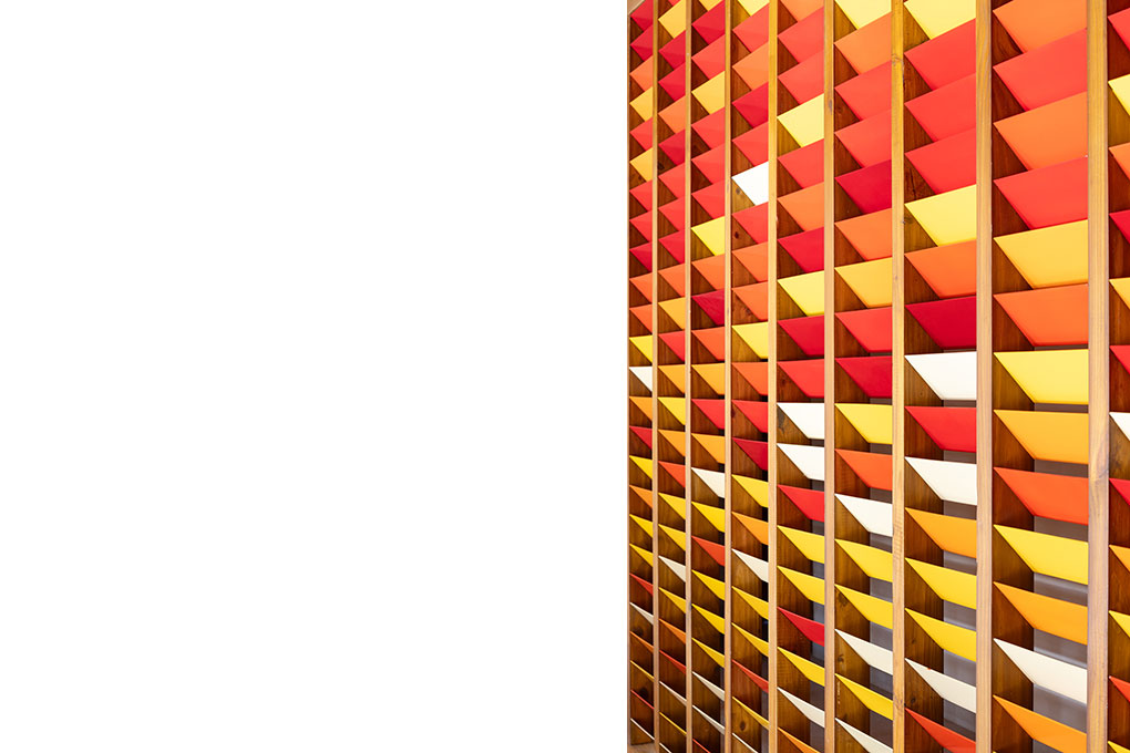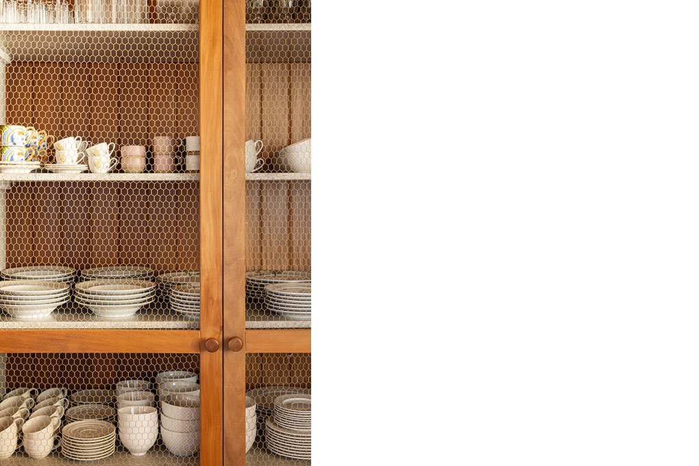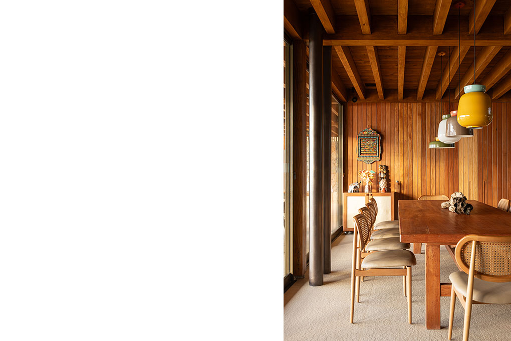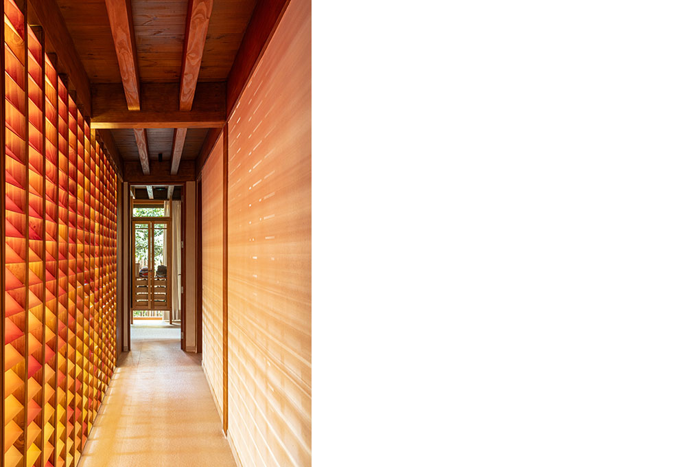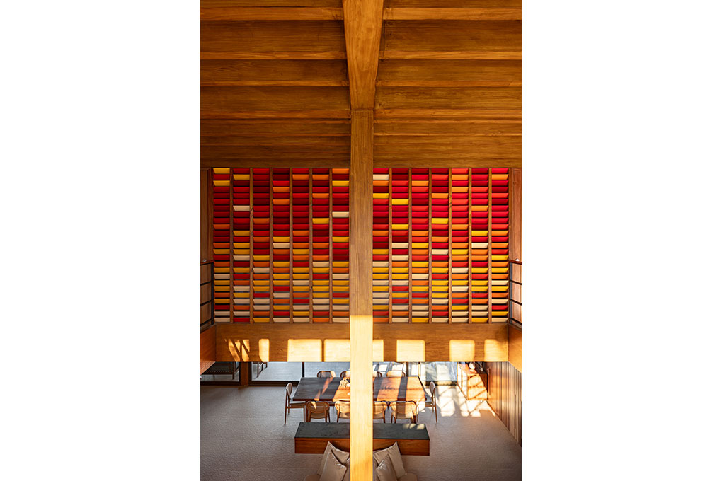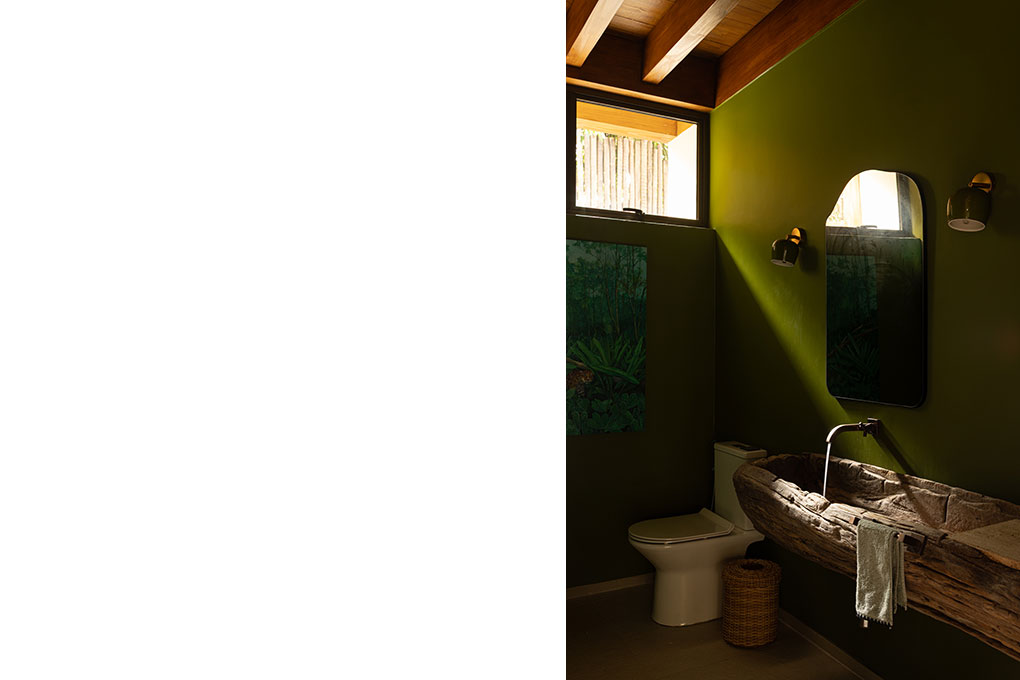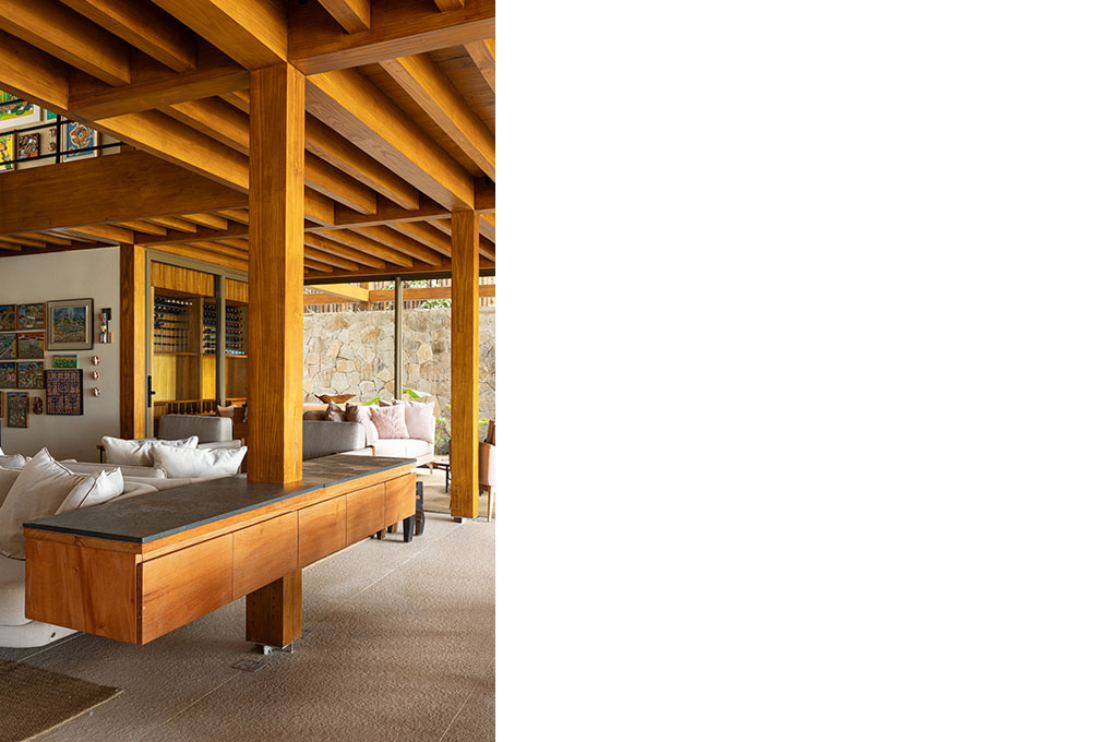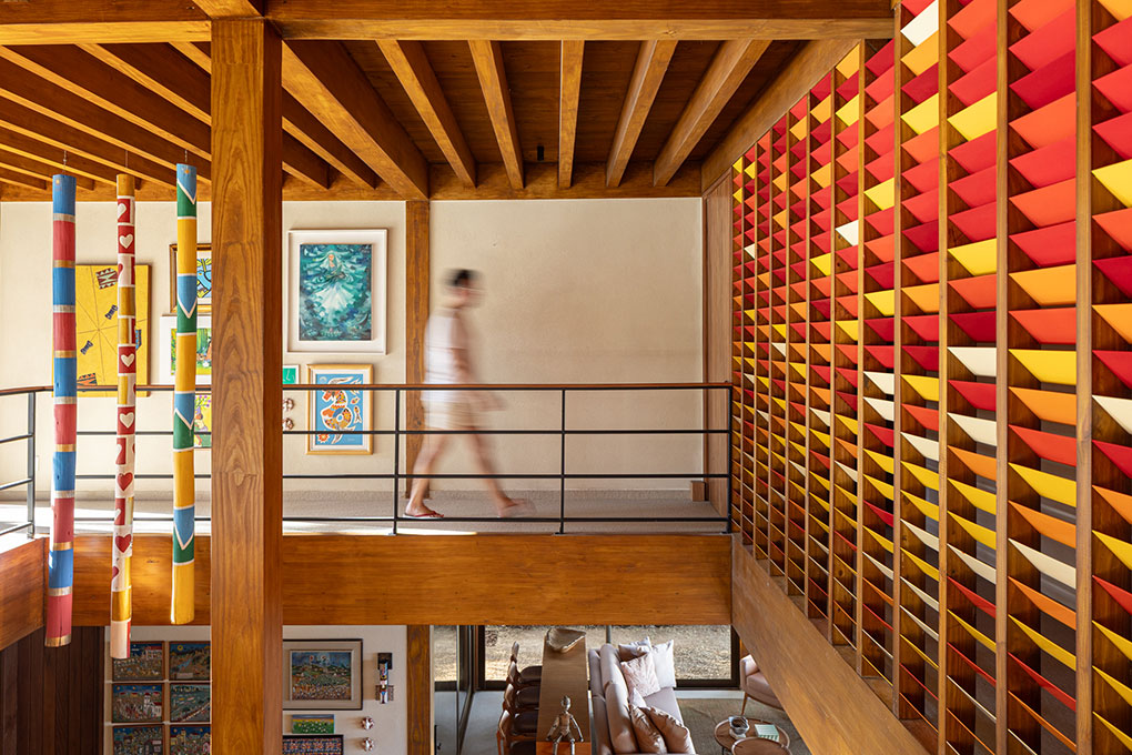 O BLOCO Arquitetos é o escritório responsável pelo projeto de arquitetura, arquitetura de interiores e desenho do mobiliário fixo desta casa. O desenho do painel colorido da entrada da casa também é de autoria da equipe do BLOCO. O mobiliário e as obras de arte, por sua vez, já pertenciam aos moradores.