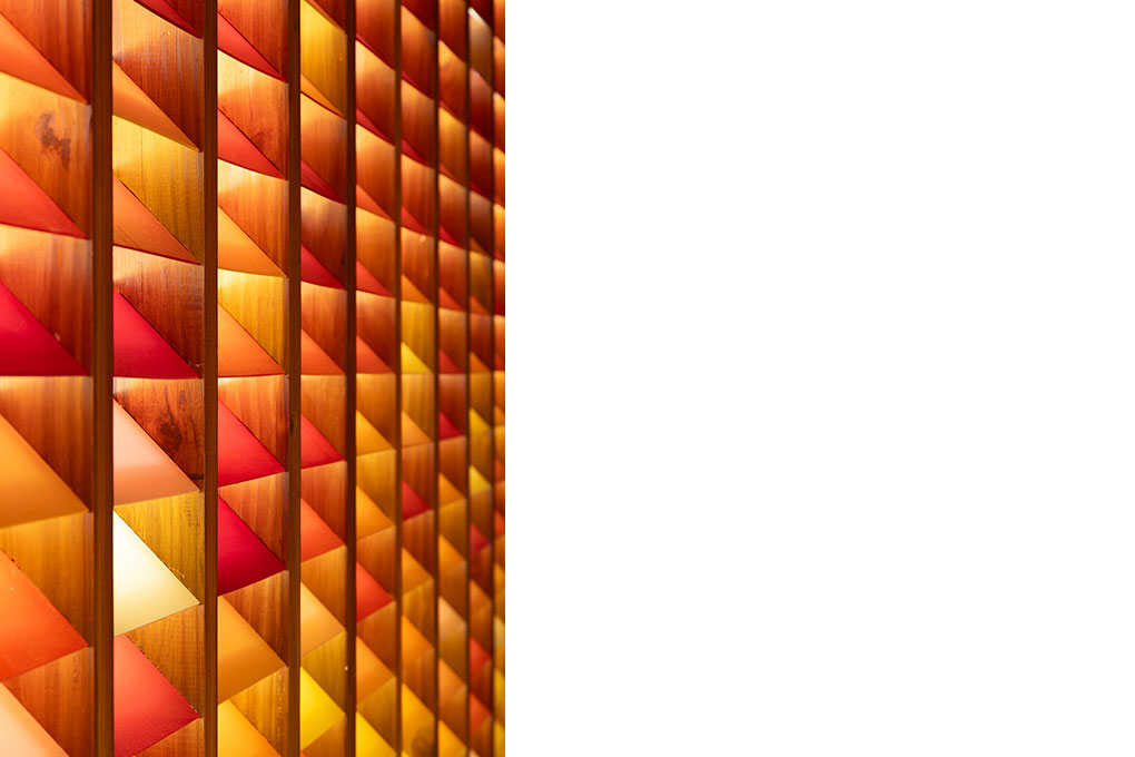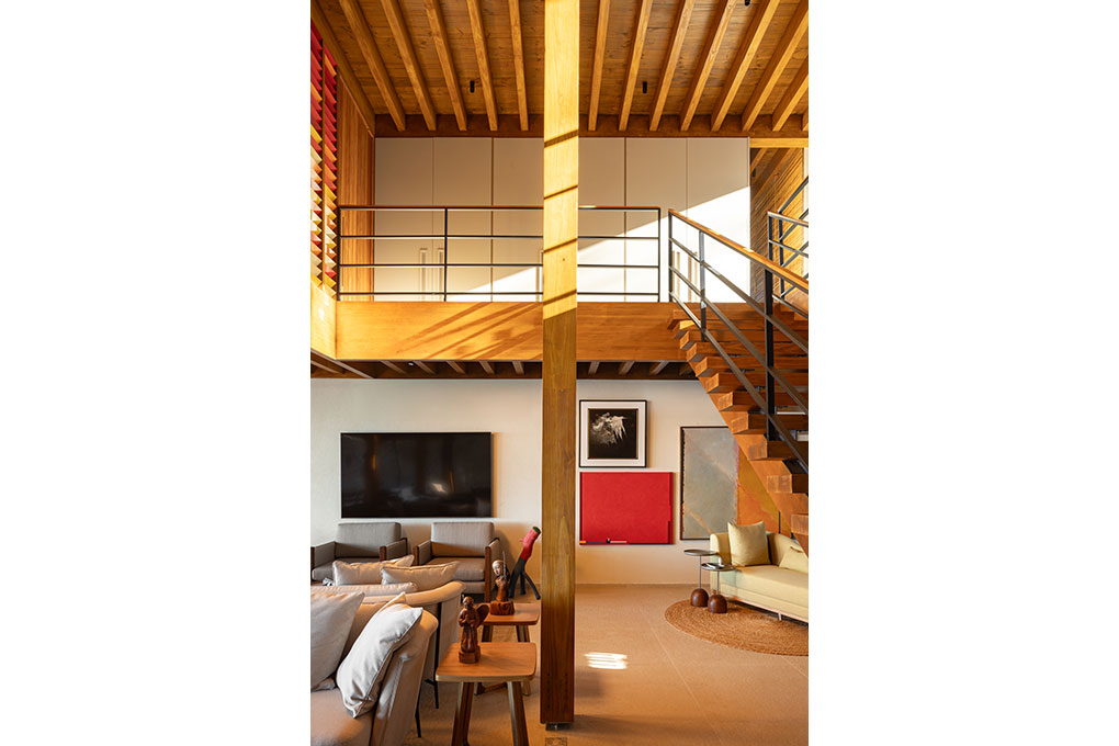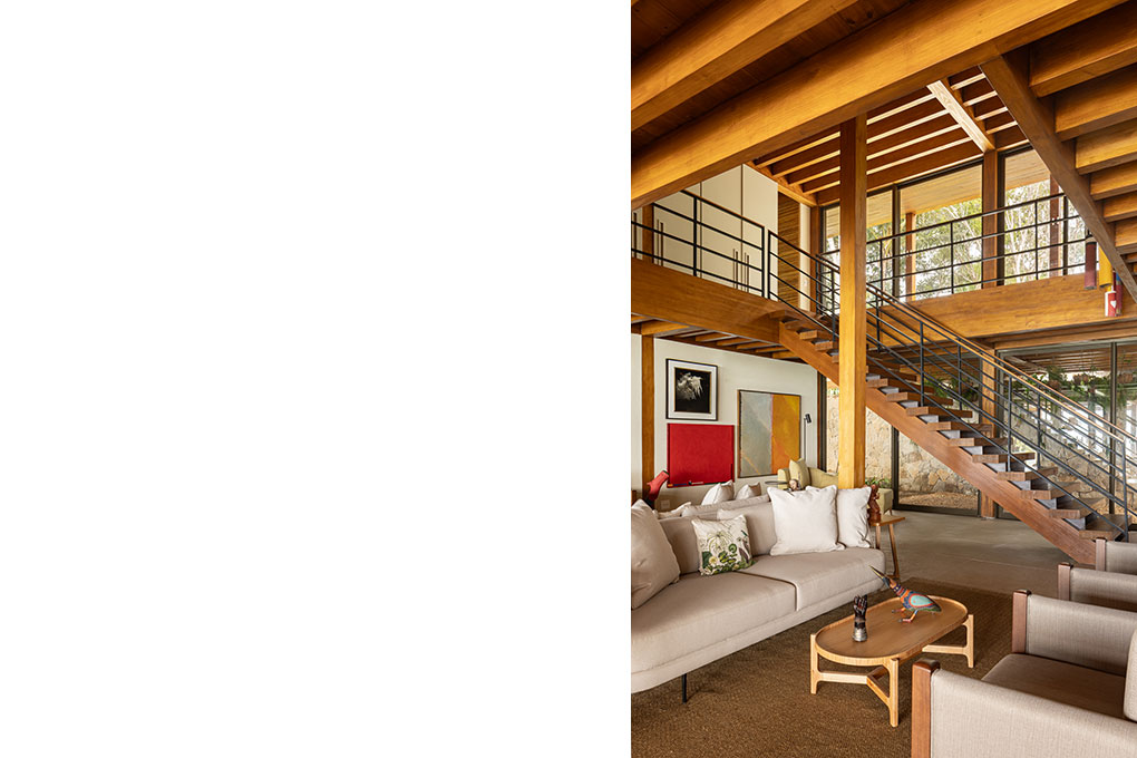 A modulação de 3,6 x 3,6 metros em grelha ortogonal define o sistema estrutural de madeira laminada colada (MLC) em Pinus, escolhido tanto por sua sustentabilidade quanto pela resistência mecânica e estabilidade dimensional em ambientes úmidos.